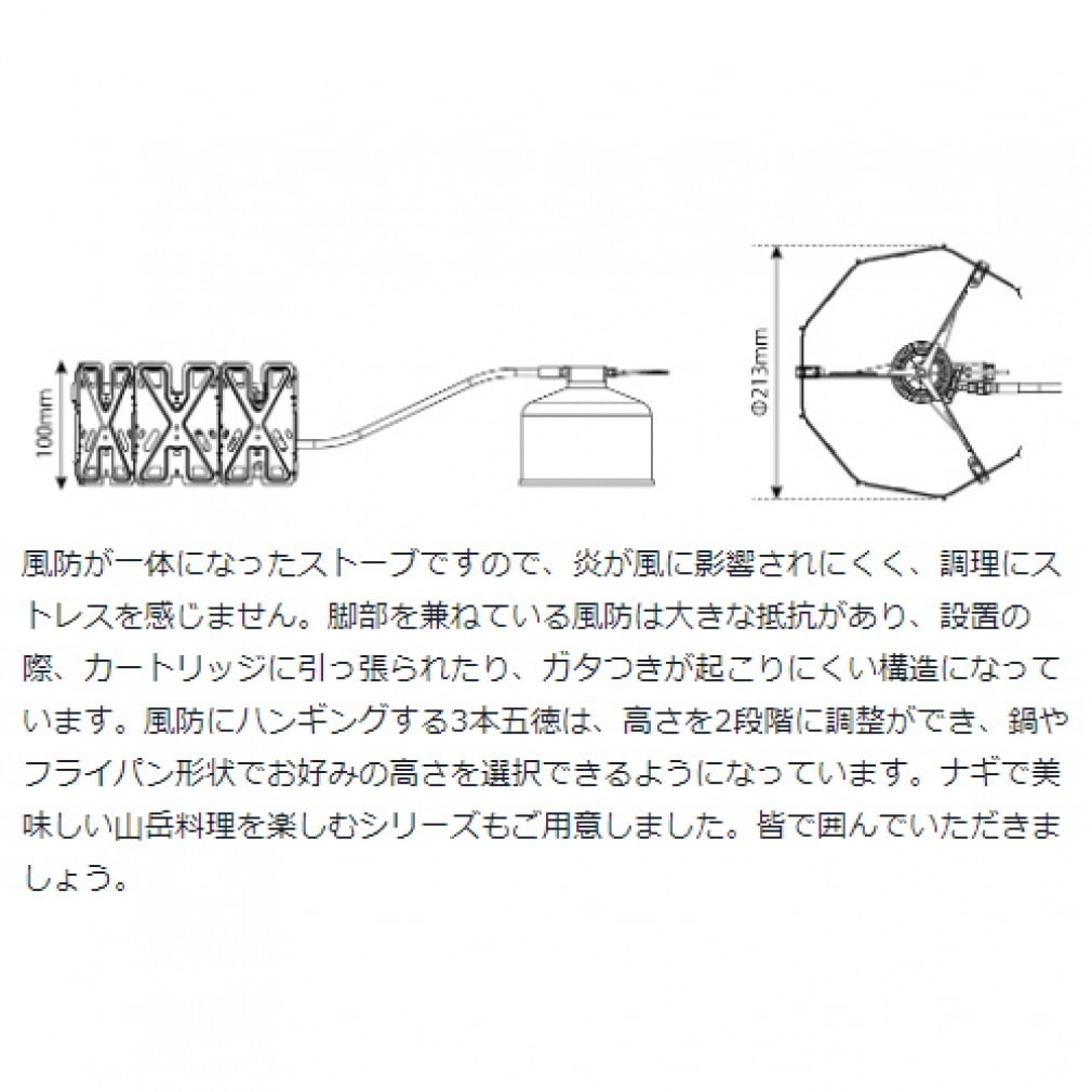 ◇風防が一体になっているため、炎が風の影響を受けにくく、調理時のストレスを感じさせない設計です。本体のゴトクを風防にセットするだけで簡単に組み立て完了。無駄がなく、シンプルな構造です。