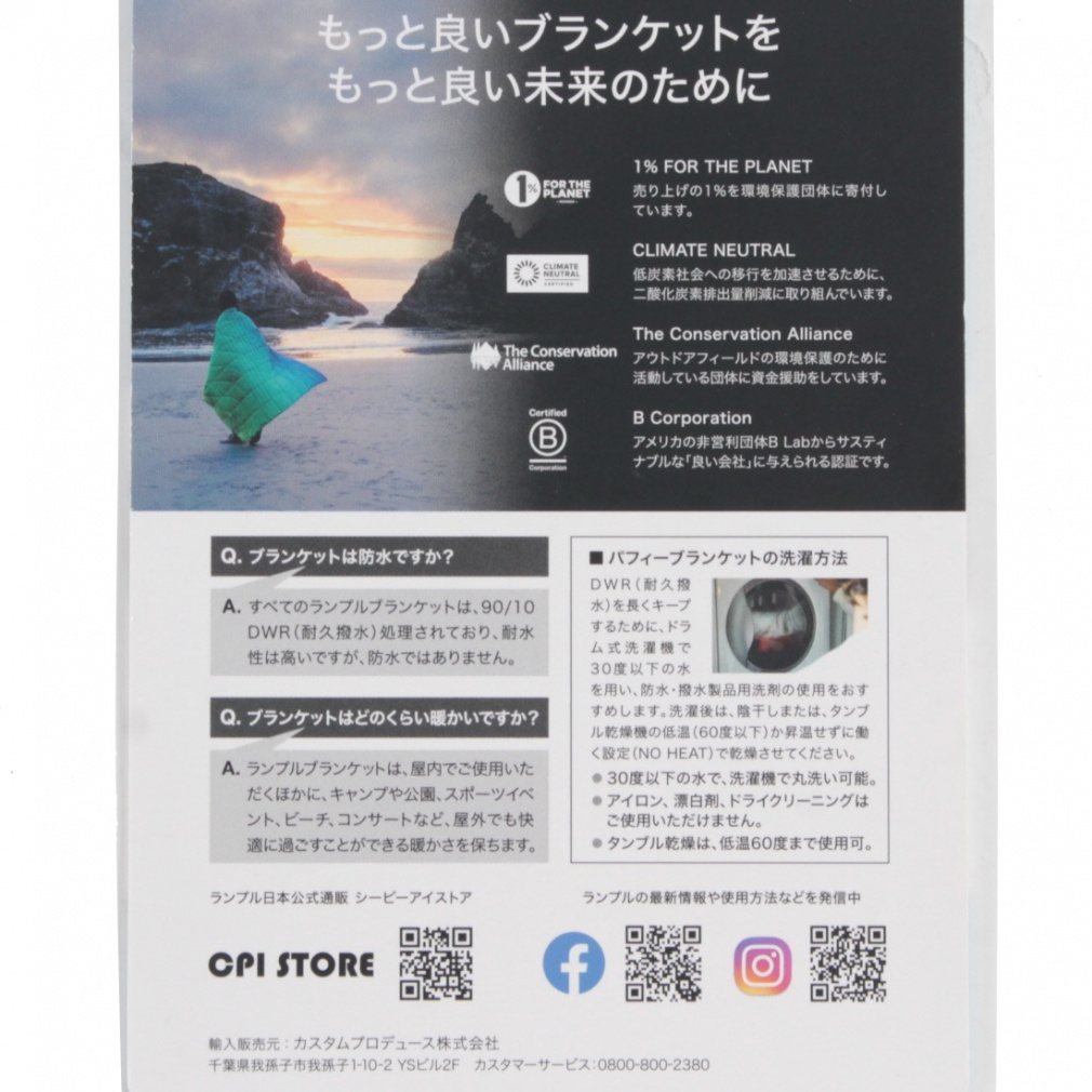 ◇オリジナル パフィーは耐久性に優れ、折り畳み可能な、どんな冒険にも対応できる気持ちの良い仲間です。車のトランクに入れて、芝生の上に広げたり、デイパックにぶら下げたりと、どこでも快適に持ち運びできます。オリジナル パフィーブランケットは、廃棄されたペットボトル60本以上を再生してシェルと断熱材を作り、これによりバージンプラスチックの使用を大幅に削減。自然環境への負担を抑えた商品づくりをしています。