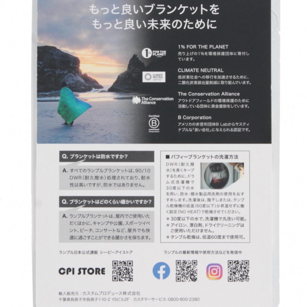 ◇オリジナル パフィーは耐久性に優れ、折り畳み可能な、どんな冒険にも対応できる気持ちの良い仲間です。車のトランクに入れて、芝生の上に広げたり、デイパックにぶら下げたりと、どこでも快適に持ち運びできます。オリジナル パフィーブランケットは、廃棄されたペットボトル60 本以上を再生してシェルと断熱材を作り、これによりバージンプラスチックの使用を大幅に削減。自然環境への負担を抑えた商品づくりをしています。