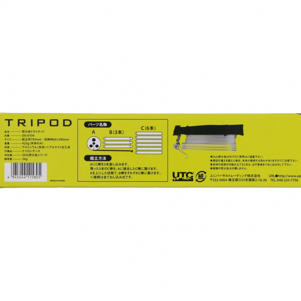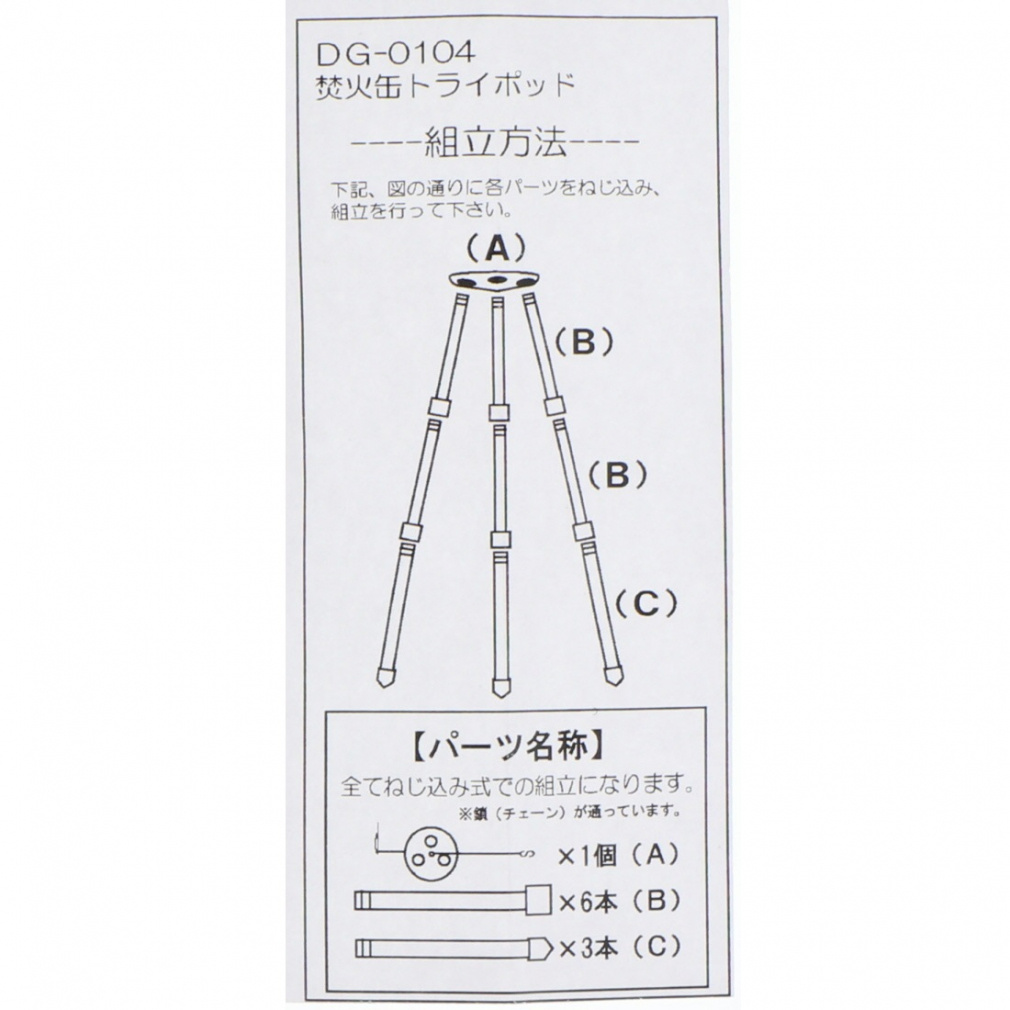 ◇焚火缶等の吊るす事ができる鍋に最適なトライポッドです。キャンプはもちろんの事ツーリング、沢登り等にも軽量の為最適です。9本のアルミ製の棒を、ネジ込んで組立てるだけで簡単に使用する事が可能。別の用途としてはガスランタン等のランタンハンガーとしての使用もできます。吊り下げ用のステンレスチェーンは上部のストッパーを利用する事で、火と鍋の距離を調整がする事ができます。
