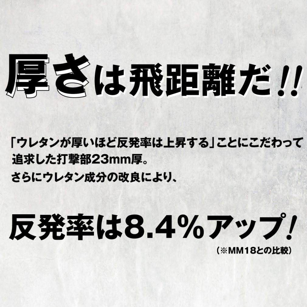◇打撃部のウレタン厚は23mmに設計され、従来モデルMM18と比べ反発率を8.4%向上。厚みのあるウレタンと改良された成分により、ボールに力強く伝わる打感を実現。グリップ部分も厚みを持たせ、振り抜きやすさを追求しました。飛距離と操作性を両立した軟式用バットです。