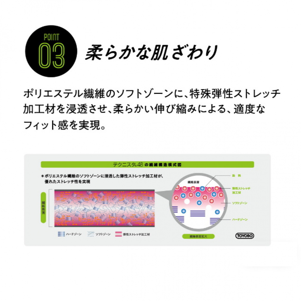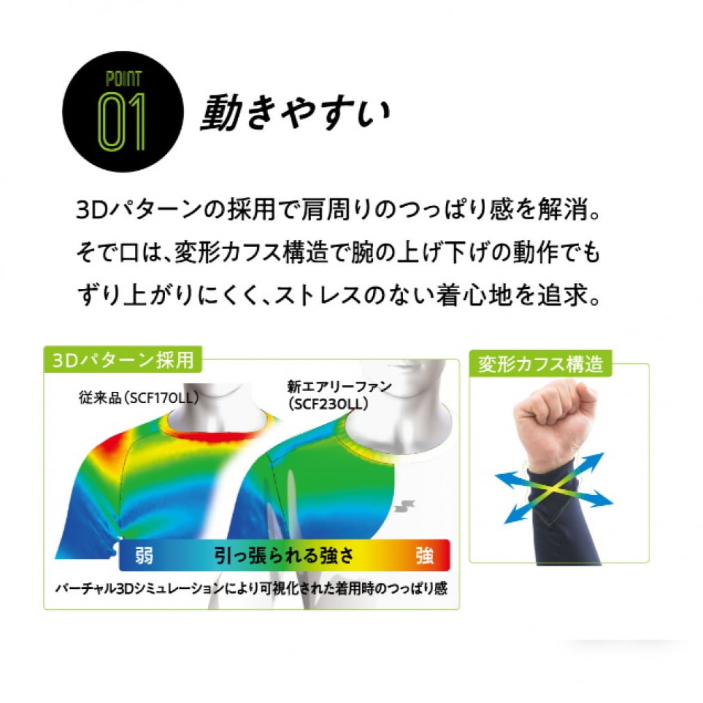 ◇生地・パターンともに進化した新Airy funシリーズ。Airy funの滑らかな生地感は残しつつ、従来品に比べ24%の軽量化、3Dパターンで肩回りのツッパリ感を改善しました。
