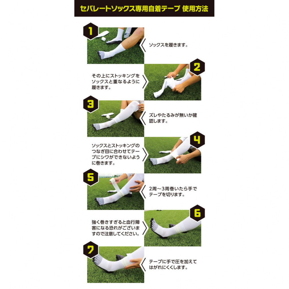 ◇現在、サッカーで主流になってきているセパレートソックスに対して、ソックスとサッカーストッキングを一体化するための靴下留めテープ。伸縮性があり、手でカット可能。