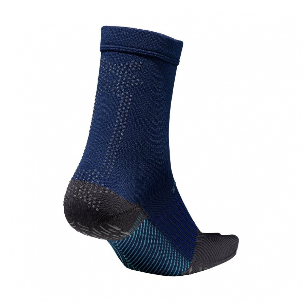 ◇グリップ力を発揮するシリコンプリント加工は「ついていれば良い」のではなく、フットボールに求められる仕様を追求。踵の後側から履き口まで加工されたMCライン状のシリコンプリントは、スパイクの踵とのグリップと、カーフソックスとの重ね履きを考慮。ドット状のプリントにすることで着用感にも配慮し、機能性とデザイン性を両立。甲は上部のみに小さな面積でシリコンプリントを施すことで、スパイクへの足入れに干渉せず、シュータンの横ズレの抑制を意図した。足底は、ミズノ独自の動作解析を実施し、サッカーで最も多いとされる方向転換とターンの動きを分析。前足部は、母指球を起点に横方向に対するズレを抑制する配置・角度・太さで加工。踵は接地の安定性を意識して面で捉える配置。指先は最後の蹴り出しをサポートするよう縦方向に配置。