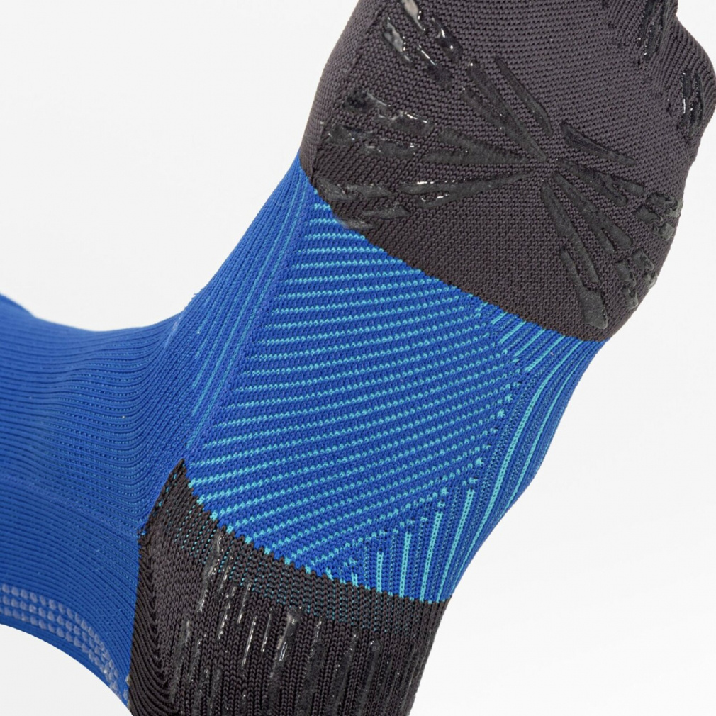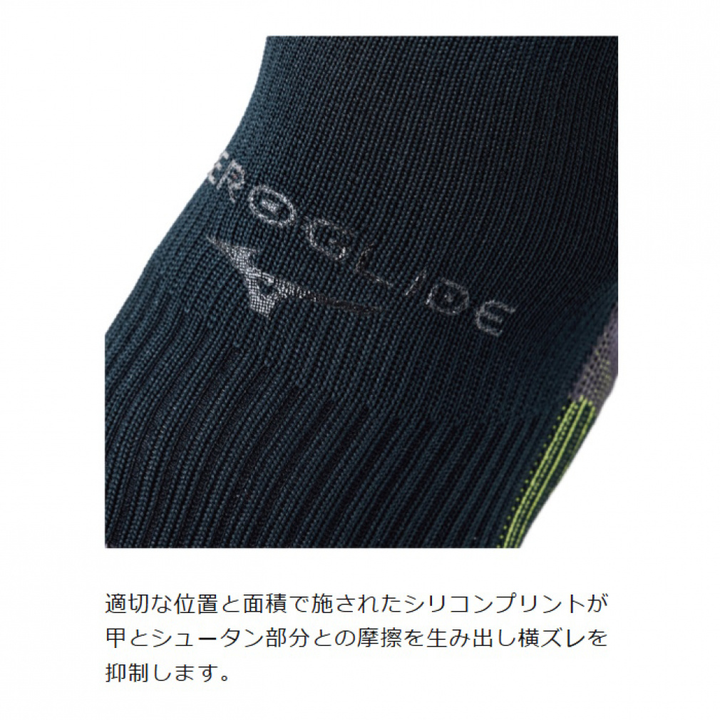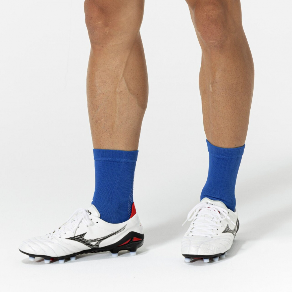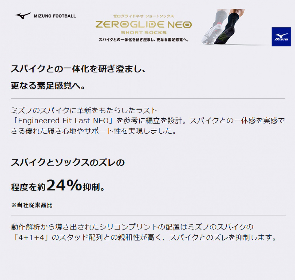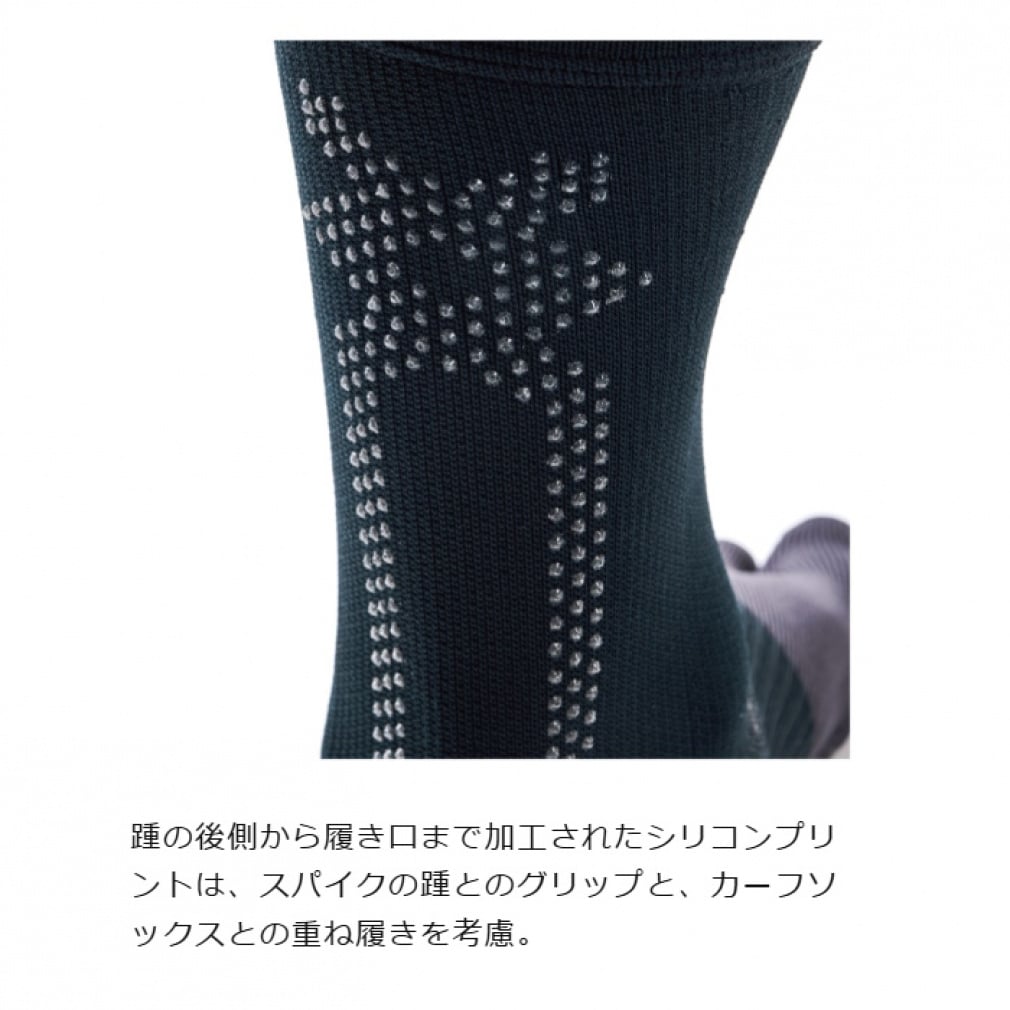 ◇グリップ力を発揮するシリコンプリント加工は「ついていれば良い」のではなく、フットボールに求められる仕様を追求。踵の後側から履き口まで加工されたMCライン状のシリコンプリントは、スパイクの踵とのグリップと、カーフソックスとの重ね履きを考慮。ドット状のプリントにすることで着用感にも配慮し、機能性とデザイン性を両立。甲は上部のみに小さな面積でシリコンプリントを施すことで、スパイクへの足入れに干渉せず、シュータンの横ズレの抑制を意図した。足底は、ミズノ独自の動作解析を実施し、サッカーで最も多いとされる方向転換とターンの動きを分析。前足部は、母指球を起点に横方向に対するズレを抑制する配置・角度・太さで加工。踵は接地の安定性を意識して面で捉える配置。指先は最後の蹴り出しをサポートするよう縦方向に配置。