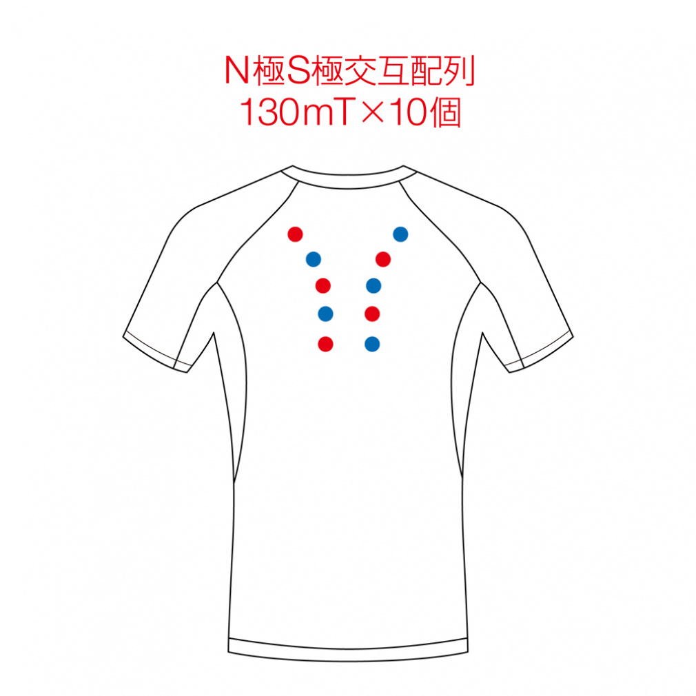 ■素材:シャツ本体:ポリエステル80% /ポリウレタン20% メッシュ部:ポリエステル86% ポリウレタン14% 磁石:フェライト永久磁石130mT(1300G)10個をN極S極交互配列