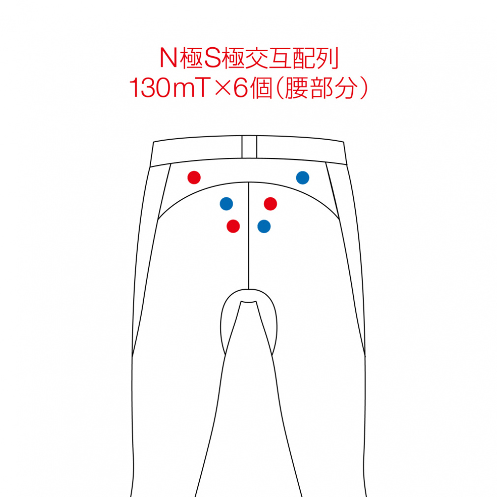 ◇フェライト永久磁石130mT(1300G)の磁石を、腰部分仙骨に沿って6個、コラントッテ独自のN極S極交互配列で配置し、装着部の血行を改善、筋肉のコリを緩和、回復を促します。