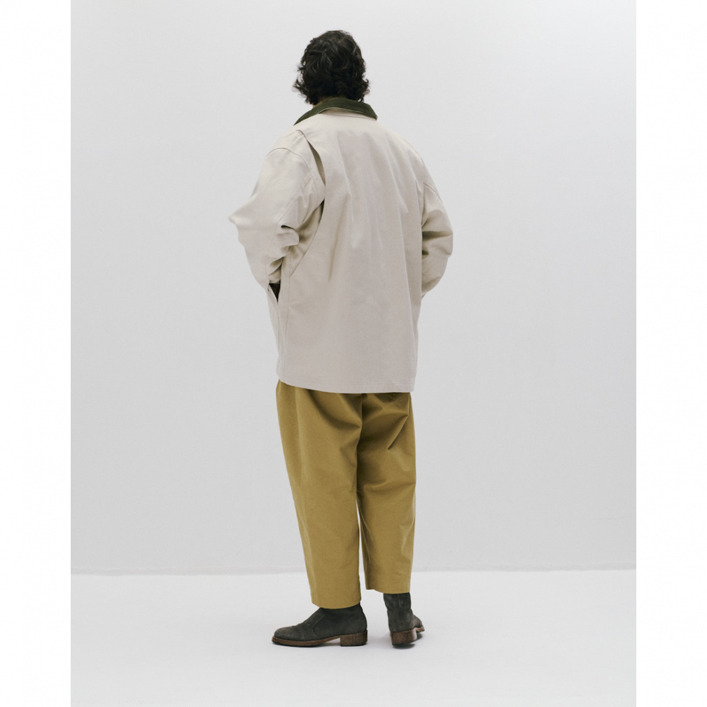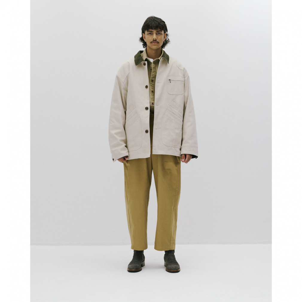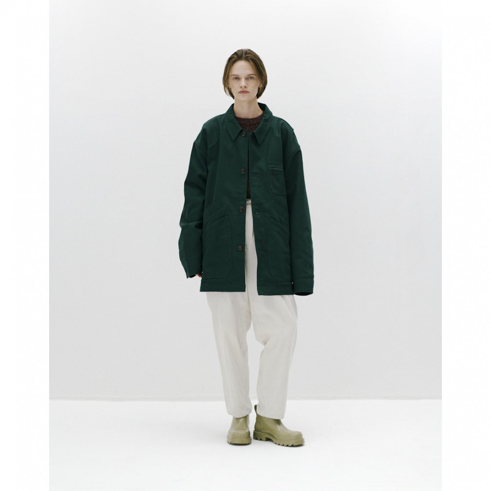 ◇クラシカルなハンティングコートを現代的なシルエットで再構築した一着。素材は、非常に頑丈なヘビーオンスのダック生地を採用。高密に織られているため、摩耗に強く、保温性を持ち、水や汚れもはじきやすいという特徴をもった素材となります。タフな環境下でも活躍する性能は、ワークウェアでは古くから使用されている実績を持ちます。カラーは、カーキ色のコーデュロイ衿が特徴のサンドと、ソリッドでまとめたディープグリーンの2色展開。使い込むほどに色合いや風合いが変化し、着用者の体に馴染んでいき、経年変化を楽しめる一着となっています。