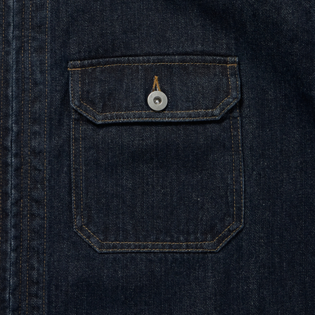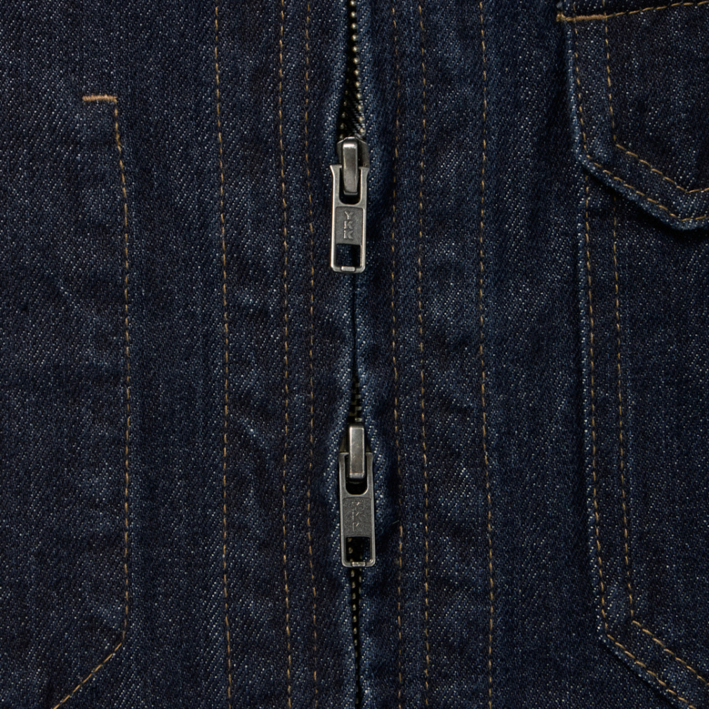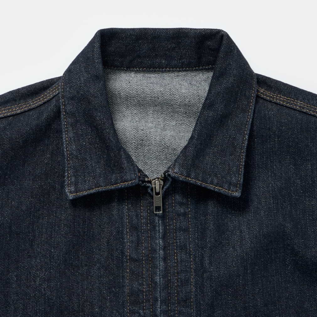◇80年代のジッパージャケットをTRIANTANらしい現代的なシルエットで再構築した一着。片側の胸ポケットだけ内ポケットにしたデザインが特徴的で、トレンドのショート丈にアレンジしました。素材は12.5ozのデニムを使用し、リンスウォッシュをかけ、糊をあらかじめ落とし、柔らかく羽織りやすい仕上がりに。カラーは何にでも合わせやすいブラックと、オーセンティックなネイビーの2色展開。ネイビーは、同素材で作成したワイドパンツとセットアップも楽しめます。3本針ステッチで頑健に仕立てており、着こむほどに増す風合いも魅力的な、長く付き合える一着となっております。