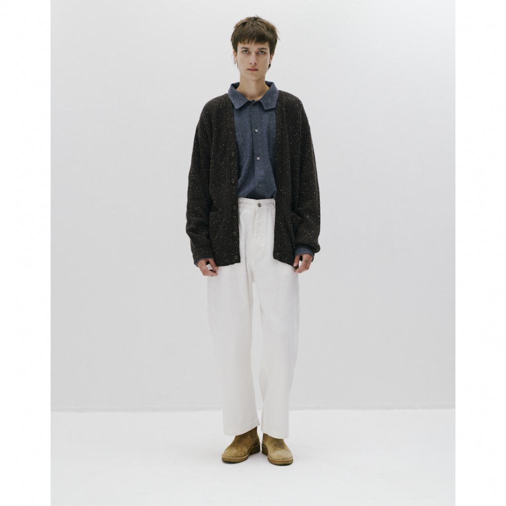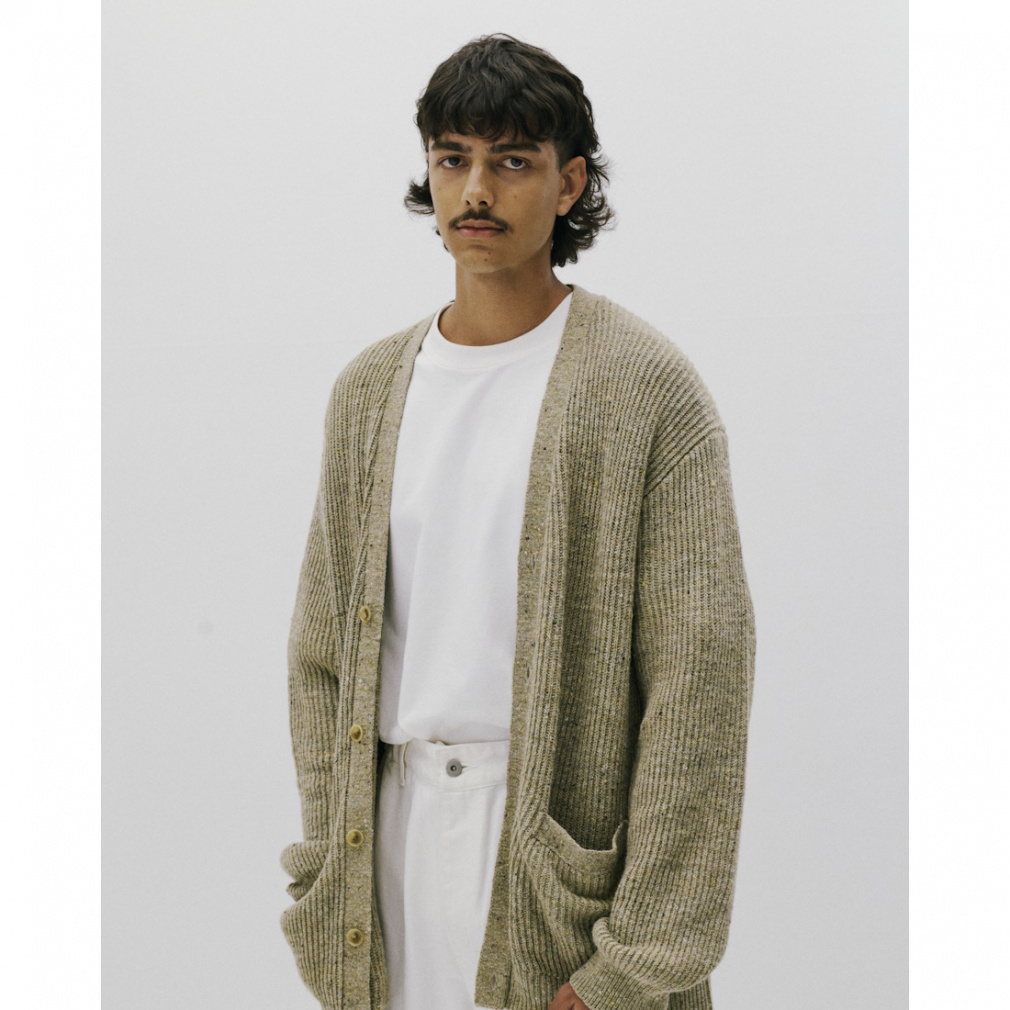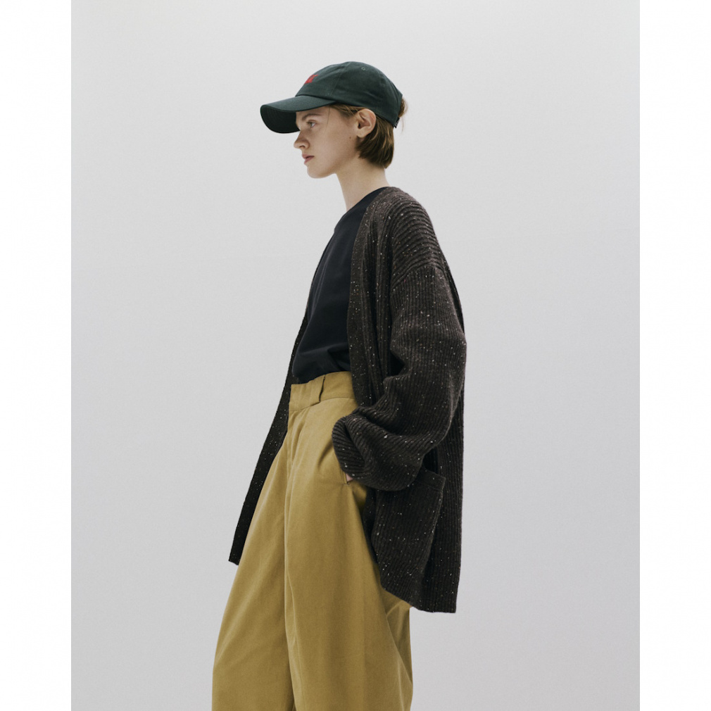 ◇ニットアイテムにカーディガンが初登場。今シーズンから刷新した、従来よりも糸番手を細くしたミドルゲージの設計で、軽量でありながら膨らみのある仕上がりとなっています。両畦編みで、LOOKのようにTシャツの上からでも軽く羽織れるよう、ゆったりとしたサイズとなっています。展開は、カラーネップが際立つペールトーンが美しいスモークグリーンと、古着をサンプリングしたどこか懐かしいカラーのダークブラウンの2色。シンプルなアイテムだからこそ、こだわりのサイジングと、編地と糸色のバランスが際立つ一着となっています。