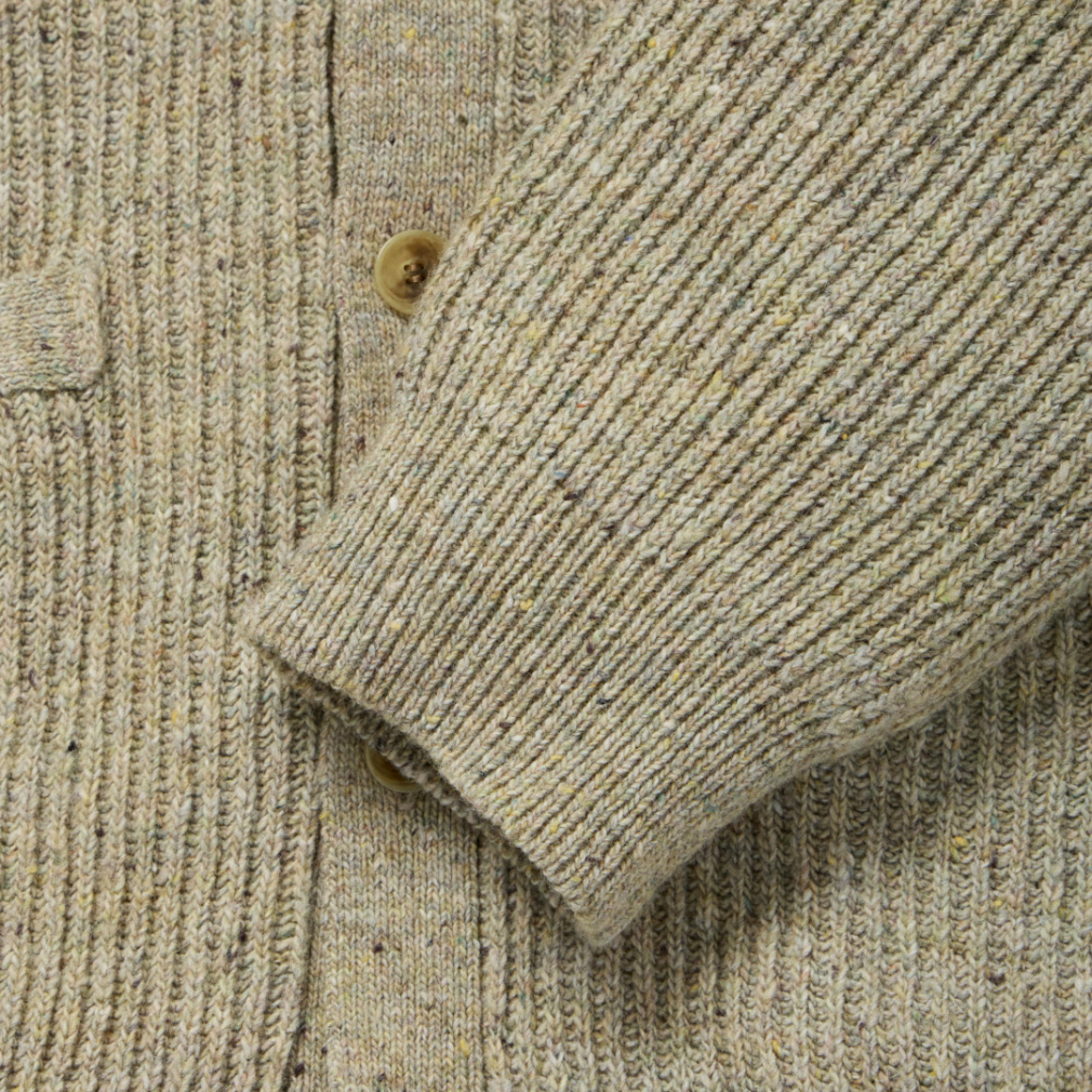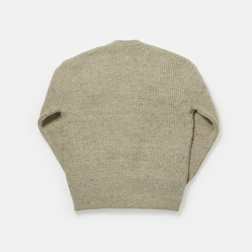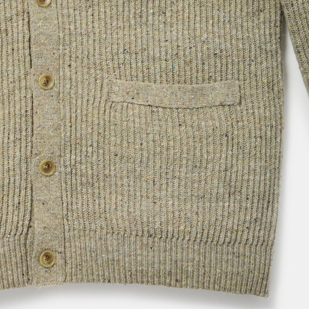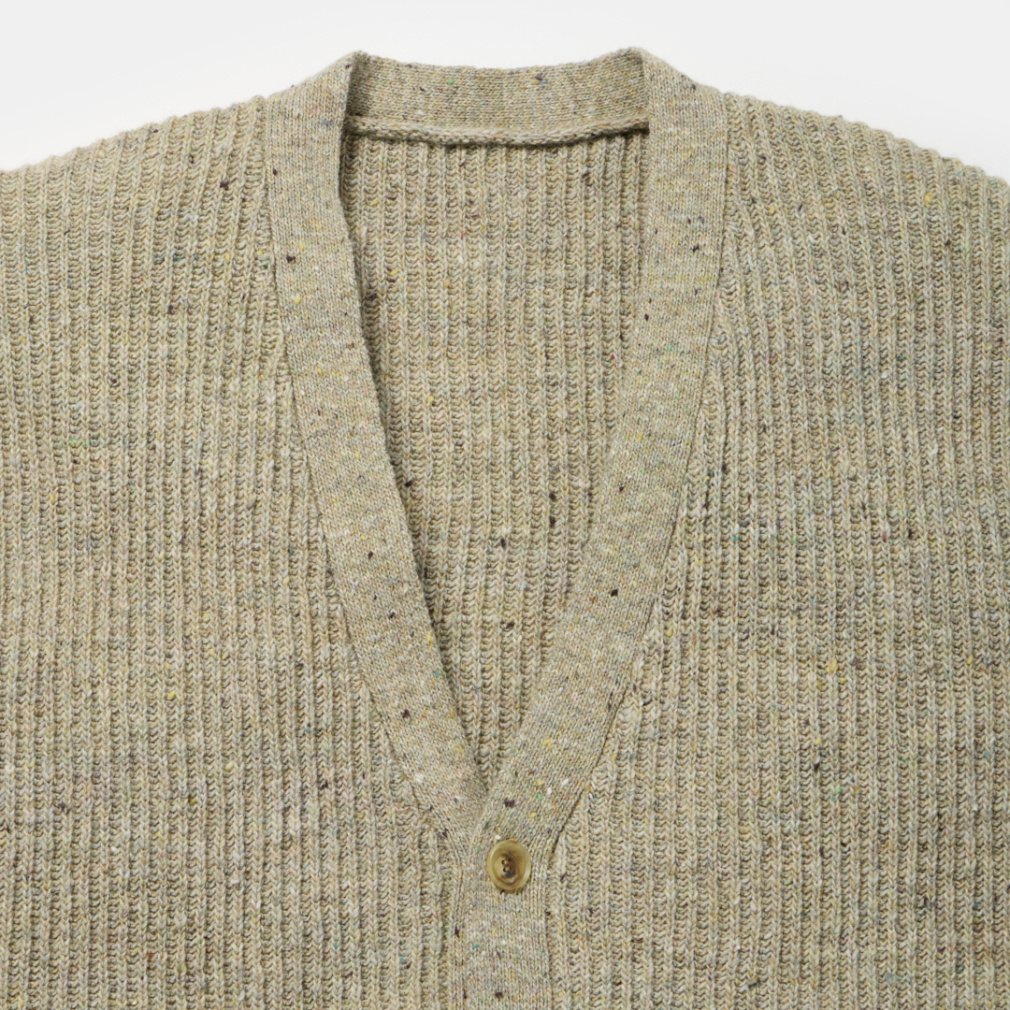 ◇ニットアイテムにカーディガンが初登場。今シーズンから刷新した、従来よりも糸番手を細くしたミドルゲージの設計で、軽量でありながら膨らみのある仕上がりとなっています。両畦編みで、LOOKのようにTシャツの上からでも軽く羽織れるよう、ゆったりとしたサイズとなっています。展開は、カラーネップが際立つペールトーンが美しいスモークグリーンと、古着をサンプリングしたどこか懐かしいカラーのダークブラウンの2色。シンプルなアイテムだからこそ、こだわりのサイジングと、編地と糸色のバランスが際立つ一着となっています。