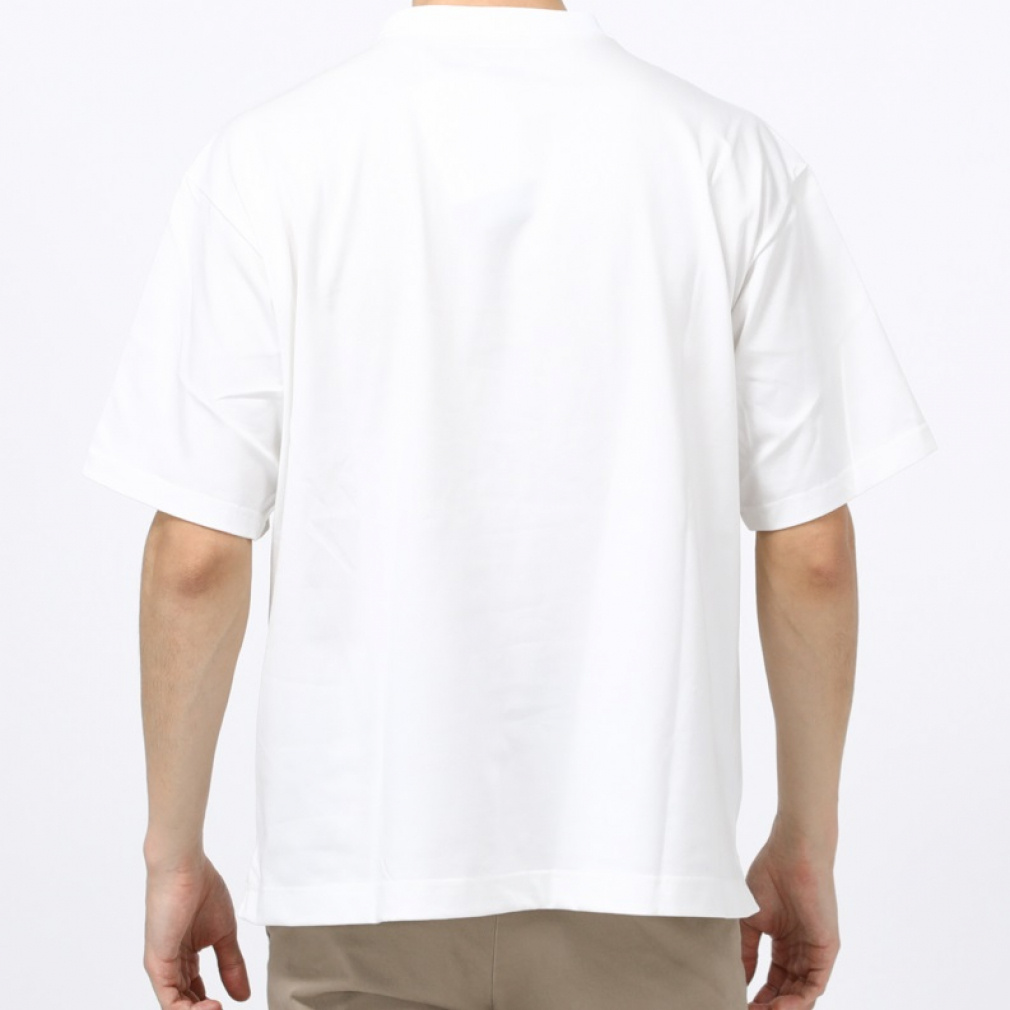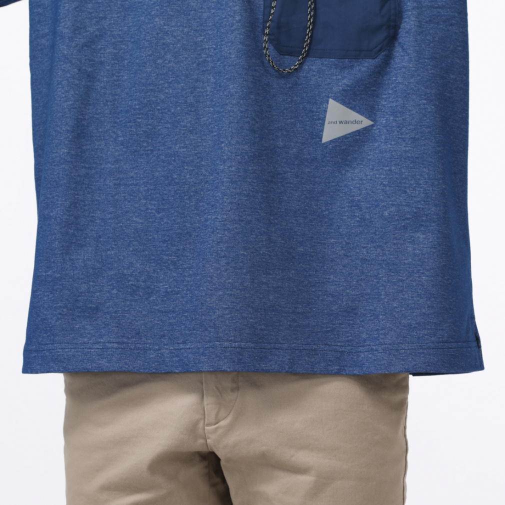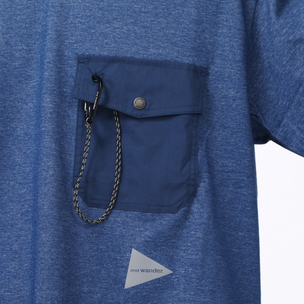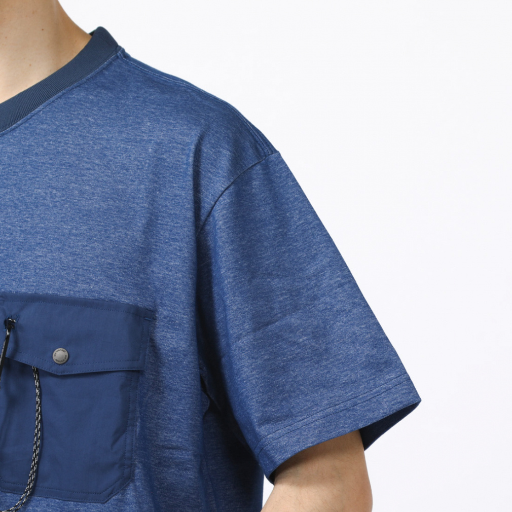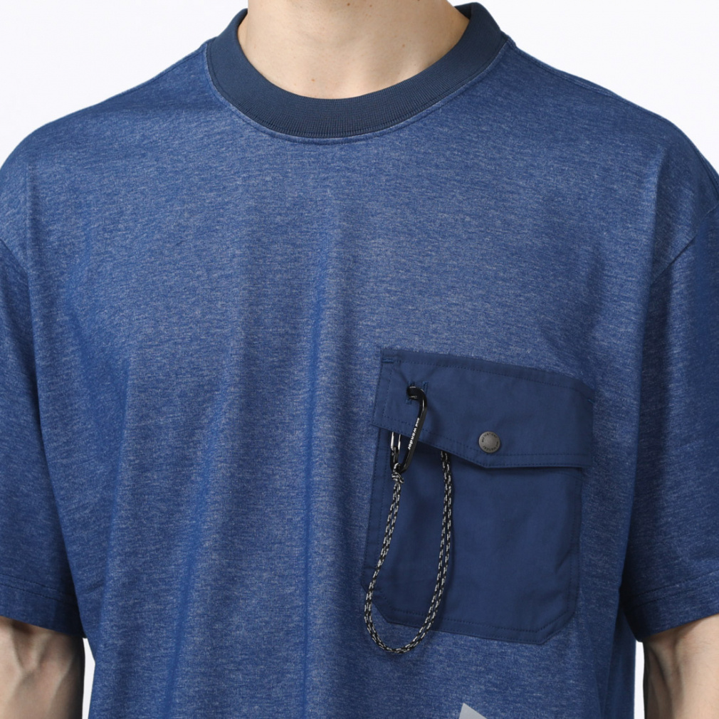 ◇カラビナつきのポケットを胸につけたTシャツです。表にコットン、肌面にクールマックスを使用したハイブリッドな天竺素材を使用しています。