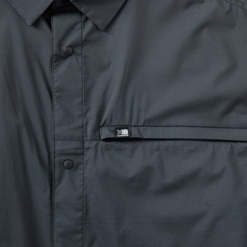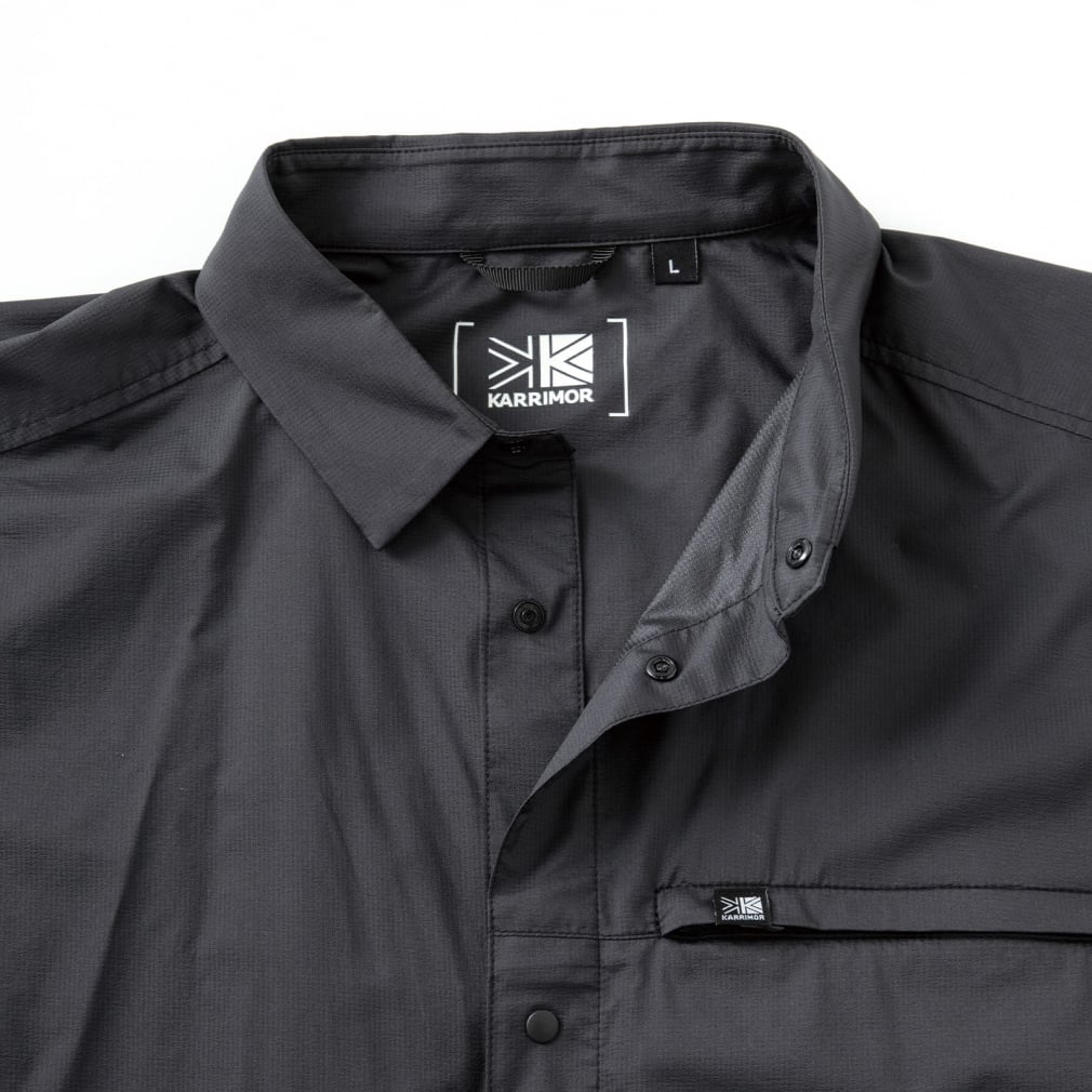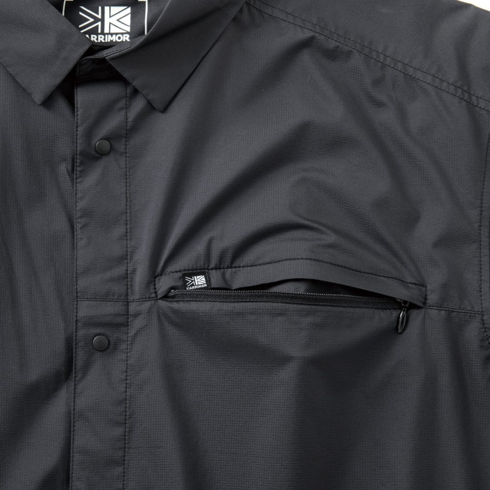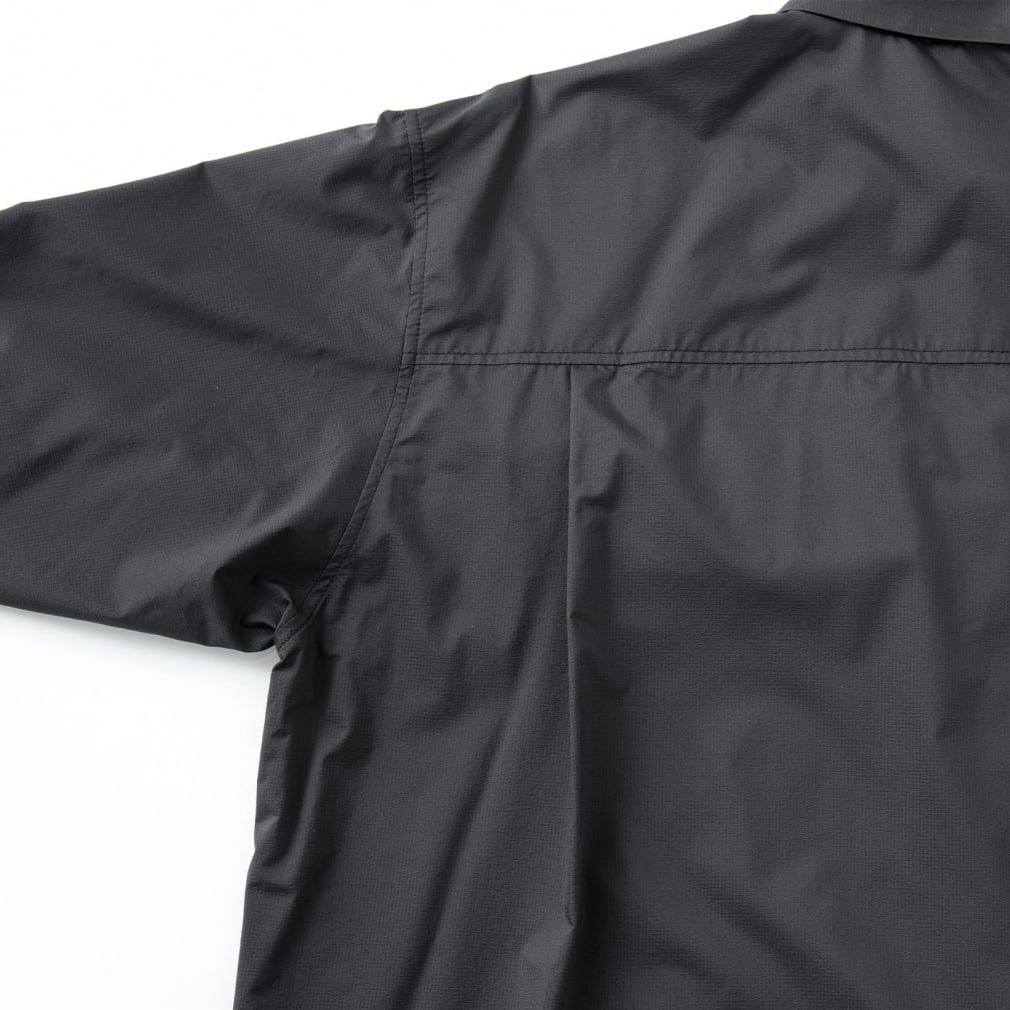 ◇軽量性と携行性に優れたウィンドシェルシャツ。スムーズな着脱を行えるようスナップボタンを採用。 左胸にはジッパー付きポケット、裾にはアジャスターコードを搭載したシンプルな外観ながらも機能性を考慮したデザインに。軽量でシワになりにくいため、携行性に優れており、アウトドアから旅行などのライフシーンまで様々なシーンで活躍する一着。
