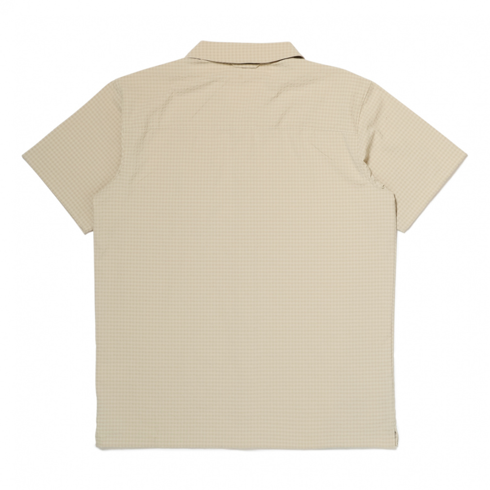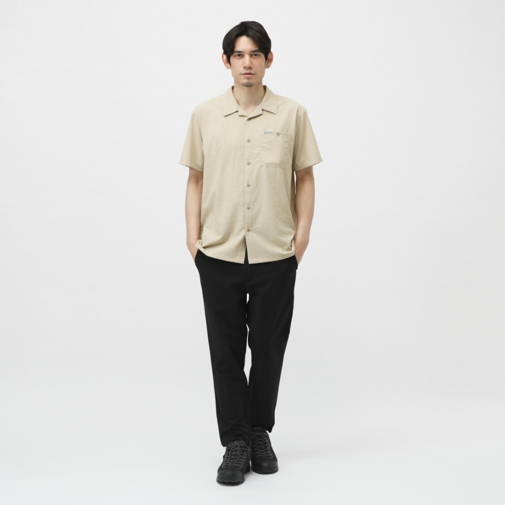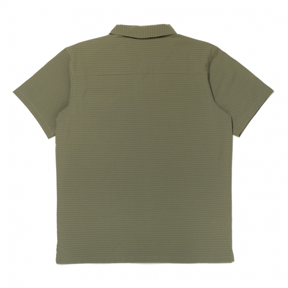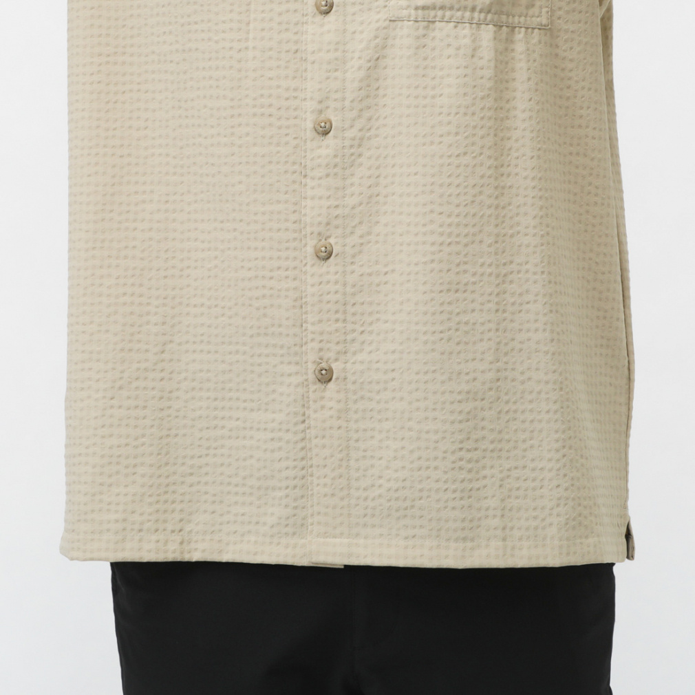 ◇さらりと肌触りの良い、ポリエステル素材の半袖シャツ。シアサッカー模様と首後ろ分のメッシュ素材で夏場でも快適に着用する事ができます。程よくストレッチが効いているため、ハイキングなどのアクティビティでも活躍します。