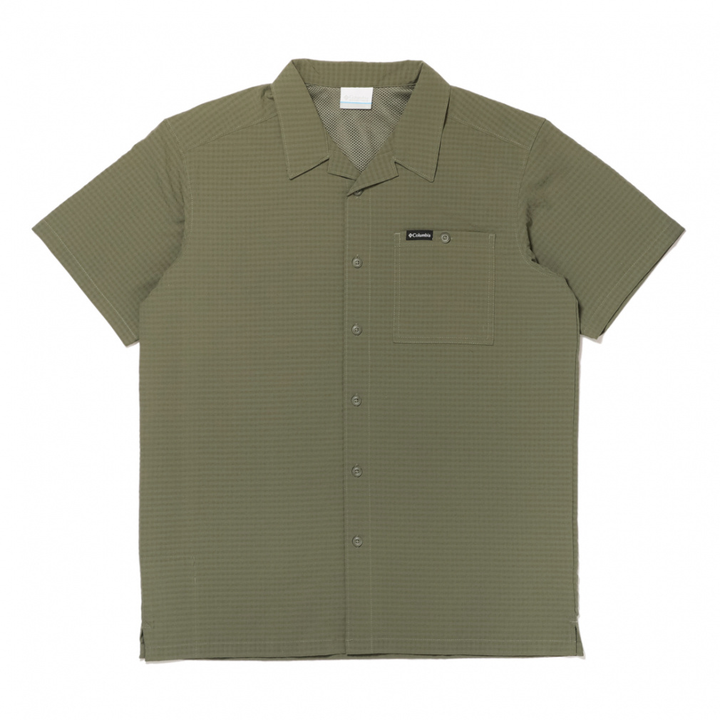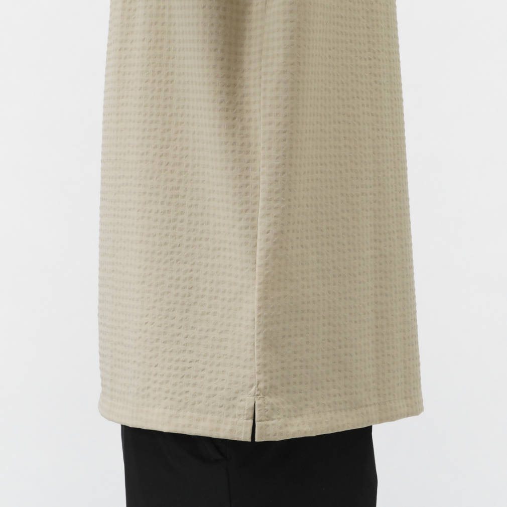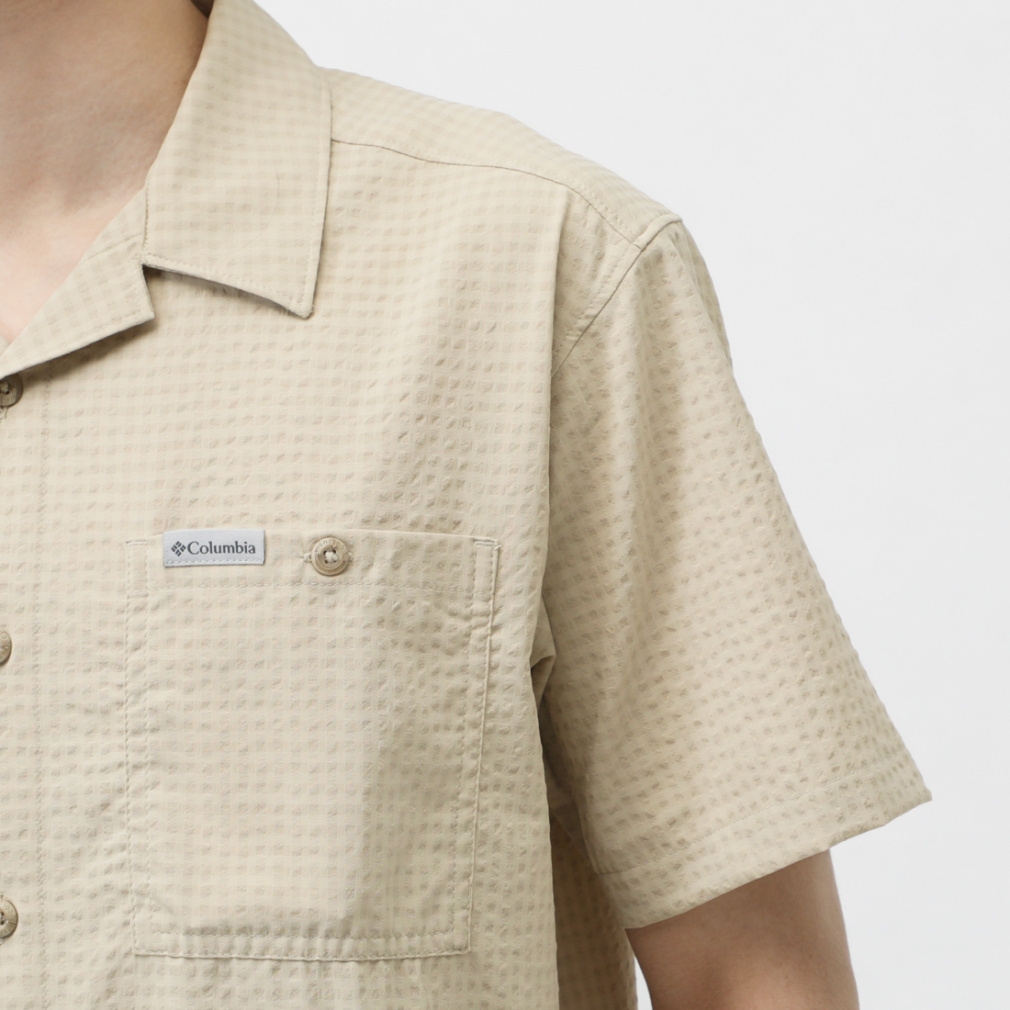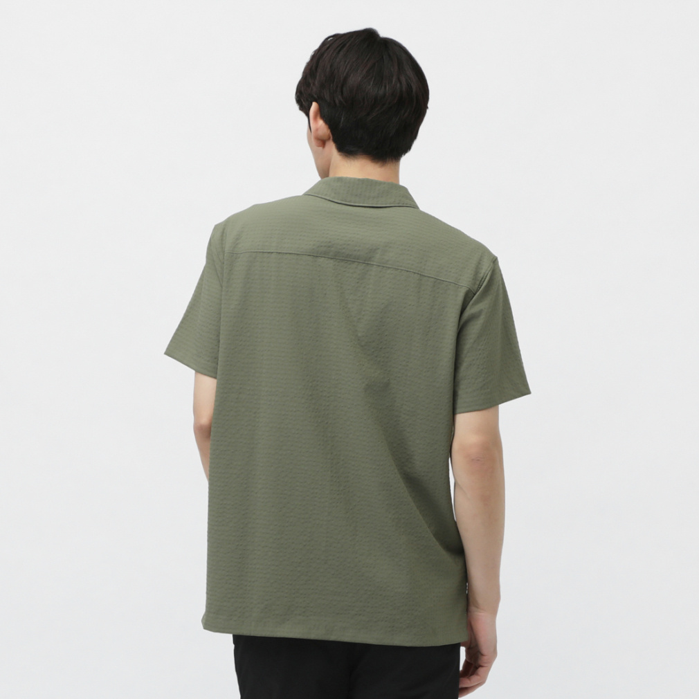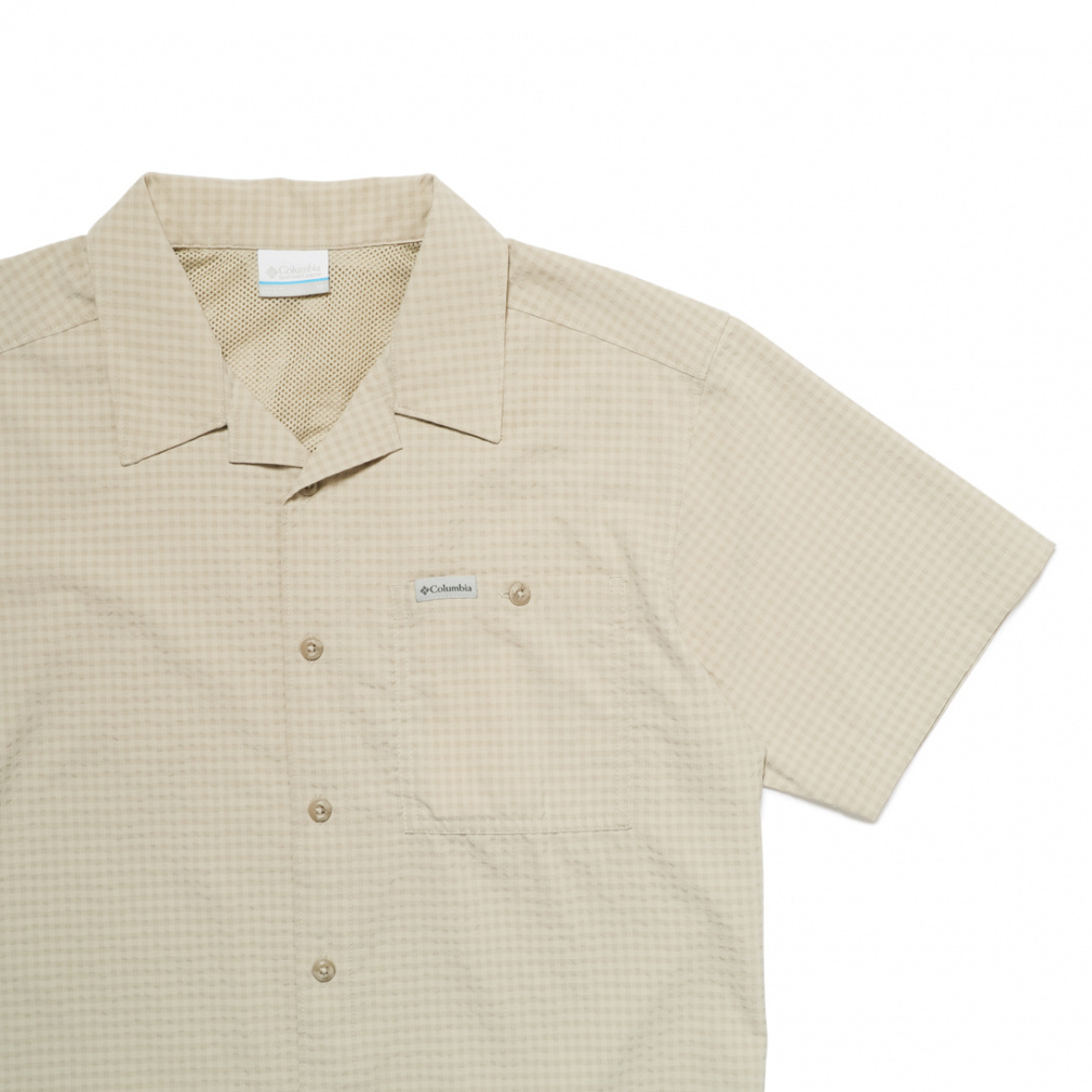 ◇さらりと肌触りの良い、ポリエステル素材の半袖シャツ。シアサッカー模様と首後ろ分のメッシュ素材で夏場でも快適に着用する事ができます。程よくストレッチが効いているため、ハイキングなどのアクティビティでも活躍します。
