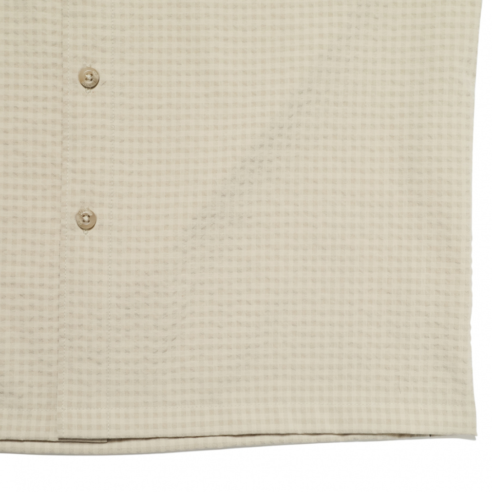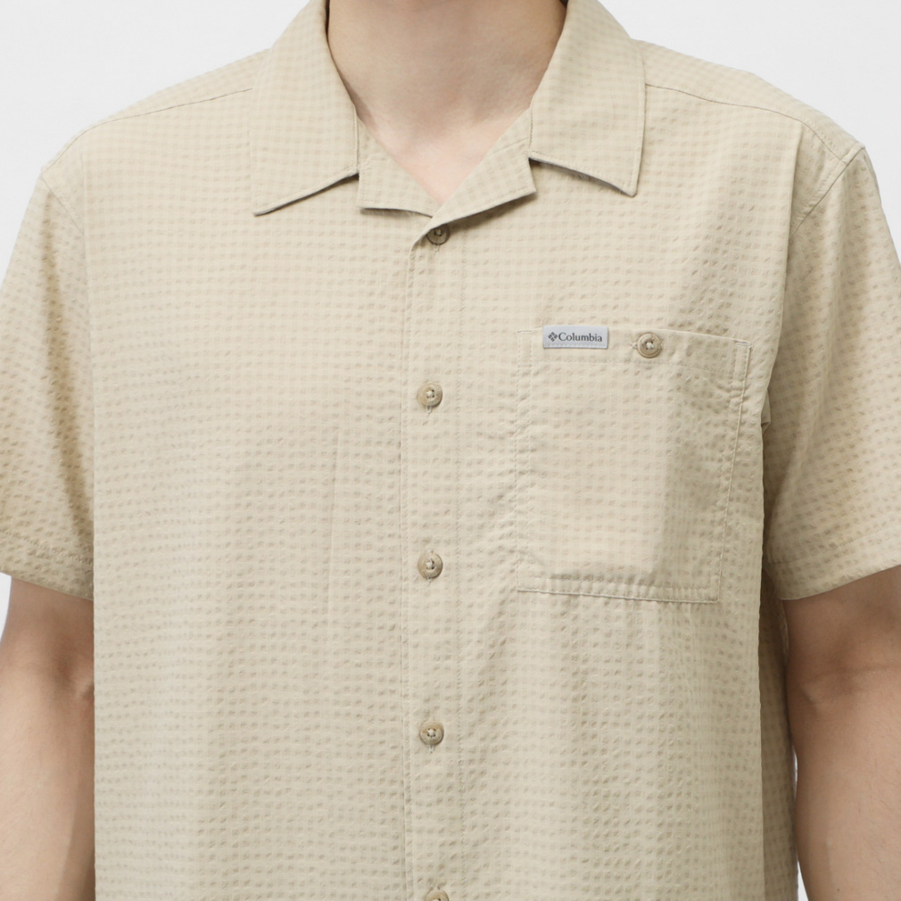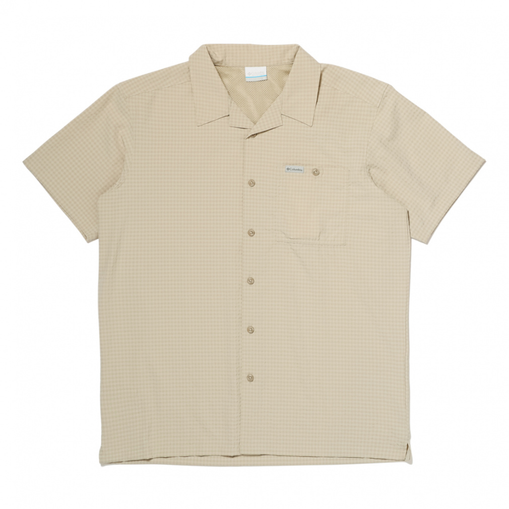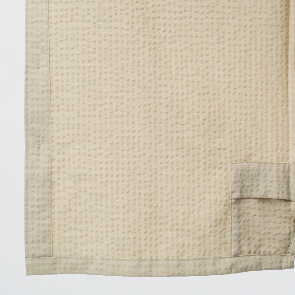 ◇さらりと肌触りの良い、ポリエステル素材の半袖シャツ。シアサッカー模様と首後ろ分のメッシュ素材で夏場でも快適に着用する事ができます。程よくストレッチが効いているため、ハイキングなどのアクティビティでも活躍します。