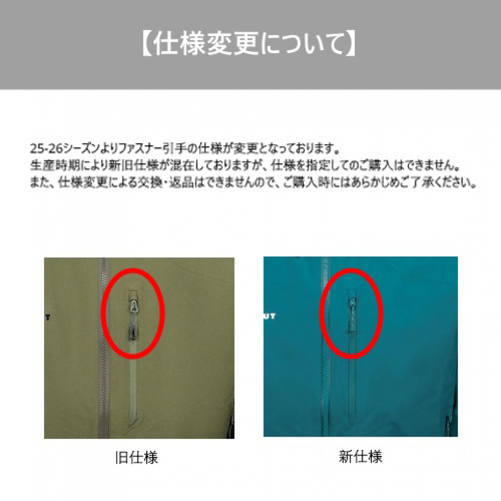 25-26シーズンよりファスナー引手の仕様が変更となっております。生産時期により新旧仕様が混在しておりますが、仕様を指定してのご購入はできません。また、仕様変更による交換・返品はできませんので、ご購入時にはあらかじめご了承ください。詳しくは画像をご確認ください。