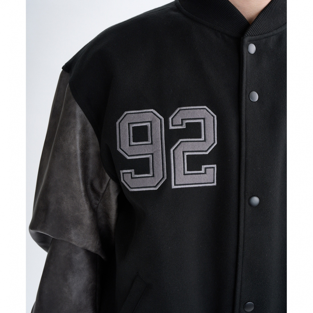◇ポリエステルウールの肉厚な素材を使用したスタジャン。袖にはフェイクレザーを使用。裏地には中綿キルト採用し保温性あり。