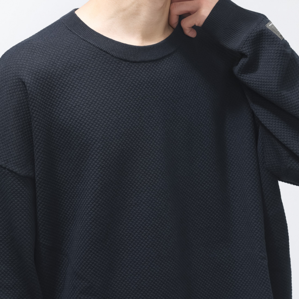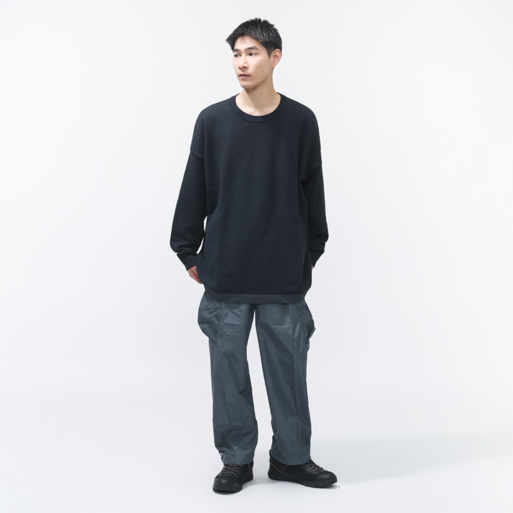 ◇中心に空洞を持つポリエステル特殊構造糸を裏面に採用したFGL PEAK SWEATER。その空洞がたっぷりの空気を含むことで、まるでフェザーのような軽やかな着心地を実現しました。さらに、表面にコットン糸を使用することで、耐摩耗性も向上。繰り返されたフィールドテストによって実現した高い機能性は、アウトドアからタウンユースまで、幅広いシーンで真価を発揮します