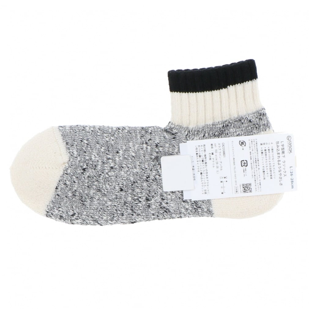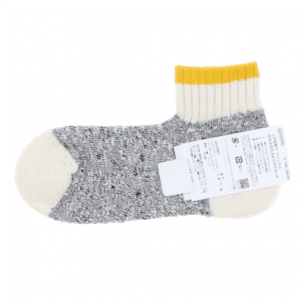 ◇粒の粗い独特な風合いの杢糸をアクセントに、モノトーンで編立てたラインソックス。足底をパイル調にふっくらと編み込んでクッション性を高めたタイプです。