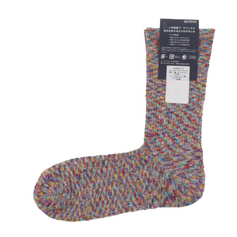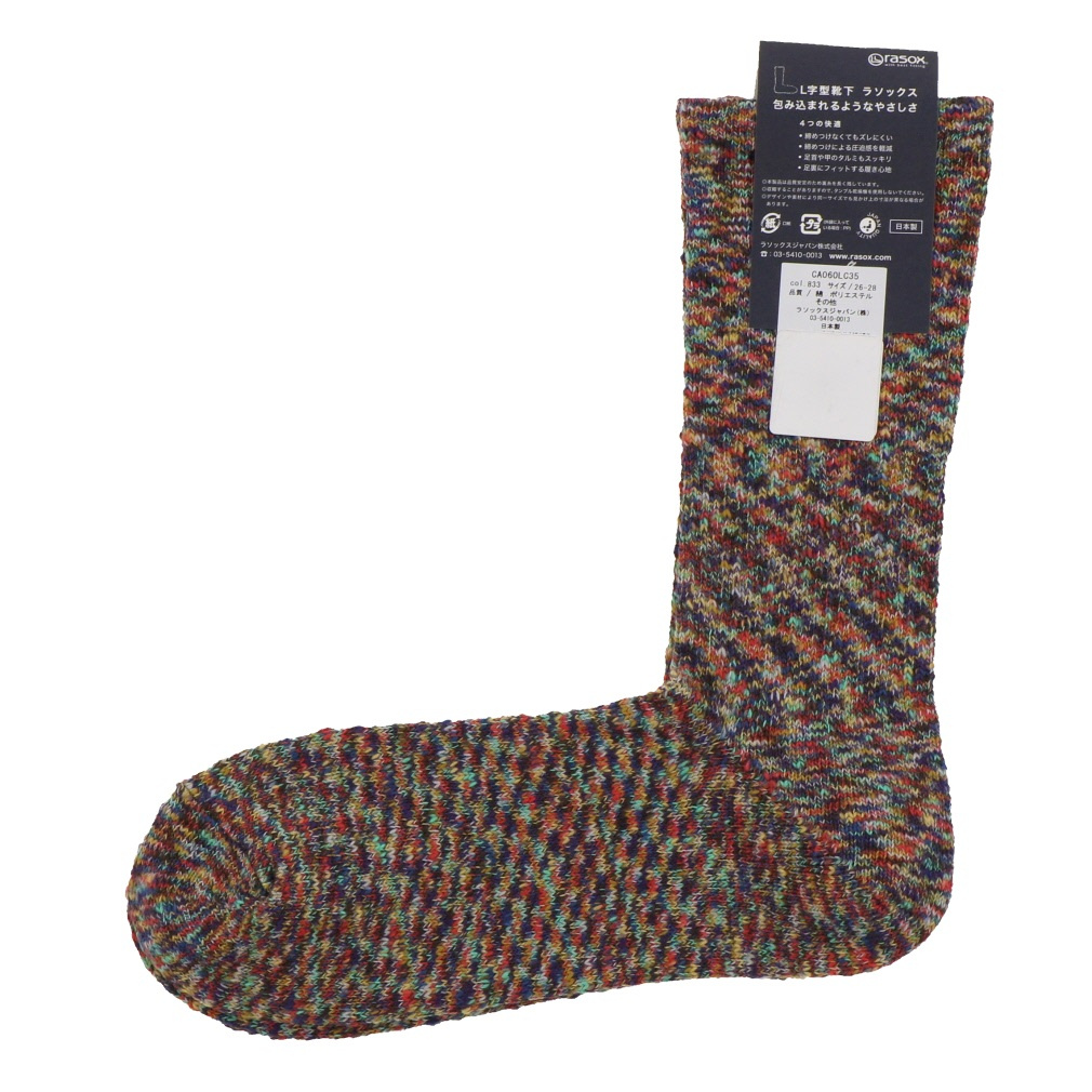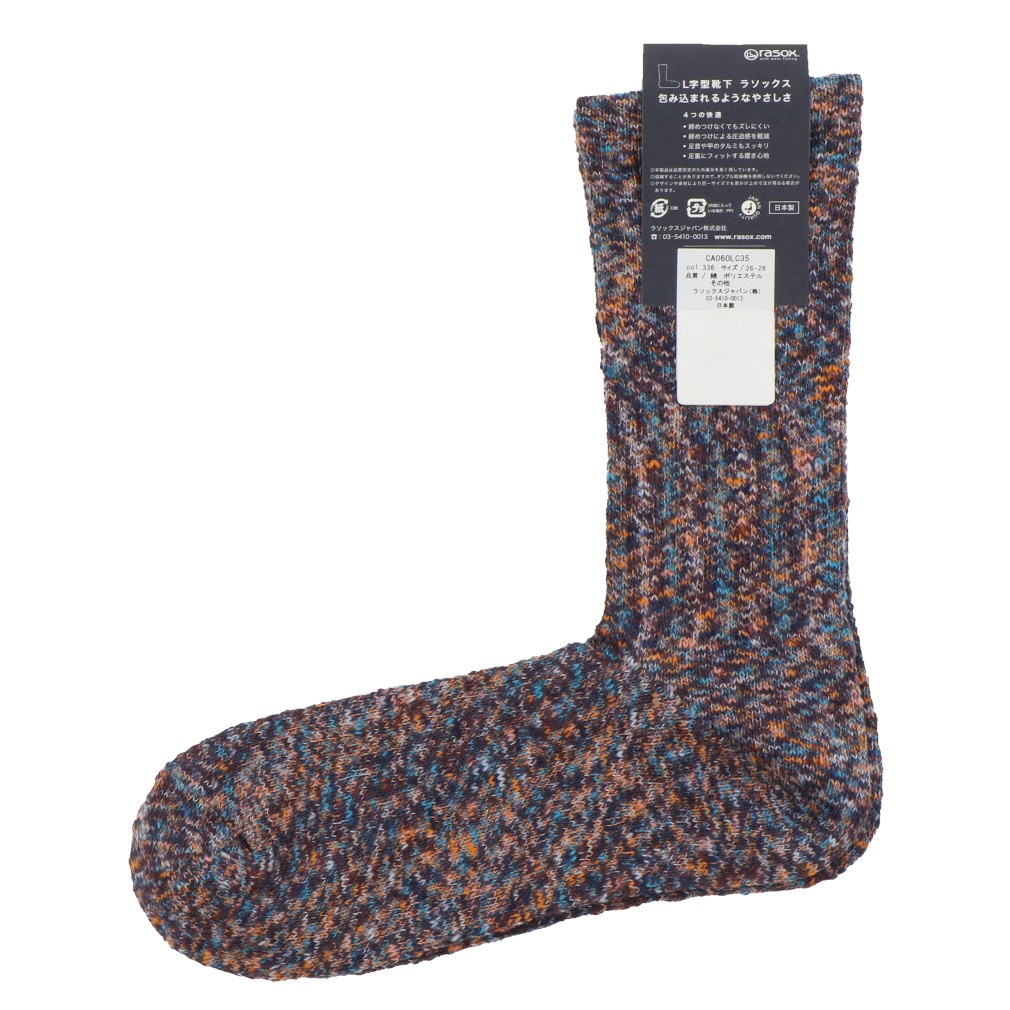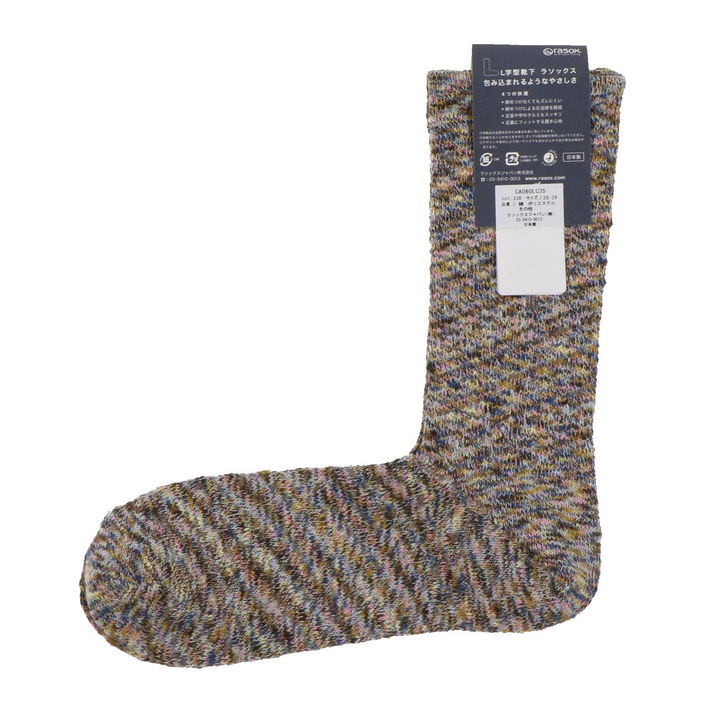 ◇ラソックスの定番靴下です。別名「雲糸」と呼ばれる太番手のスラブ糸(ムラ糸)を絣染め(かすりぞめ)にして編み込みました。