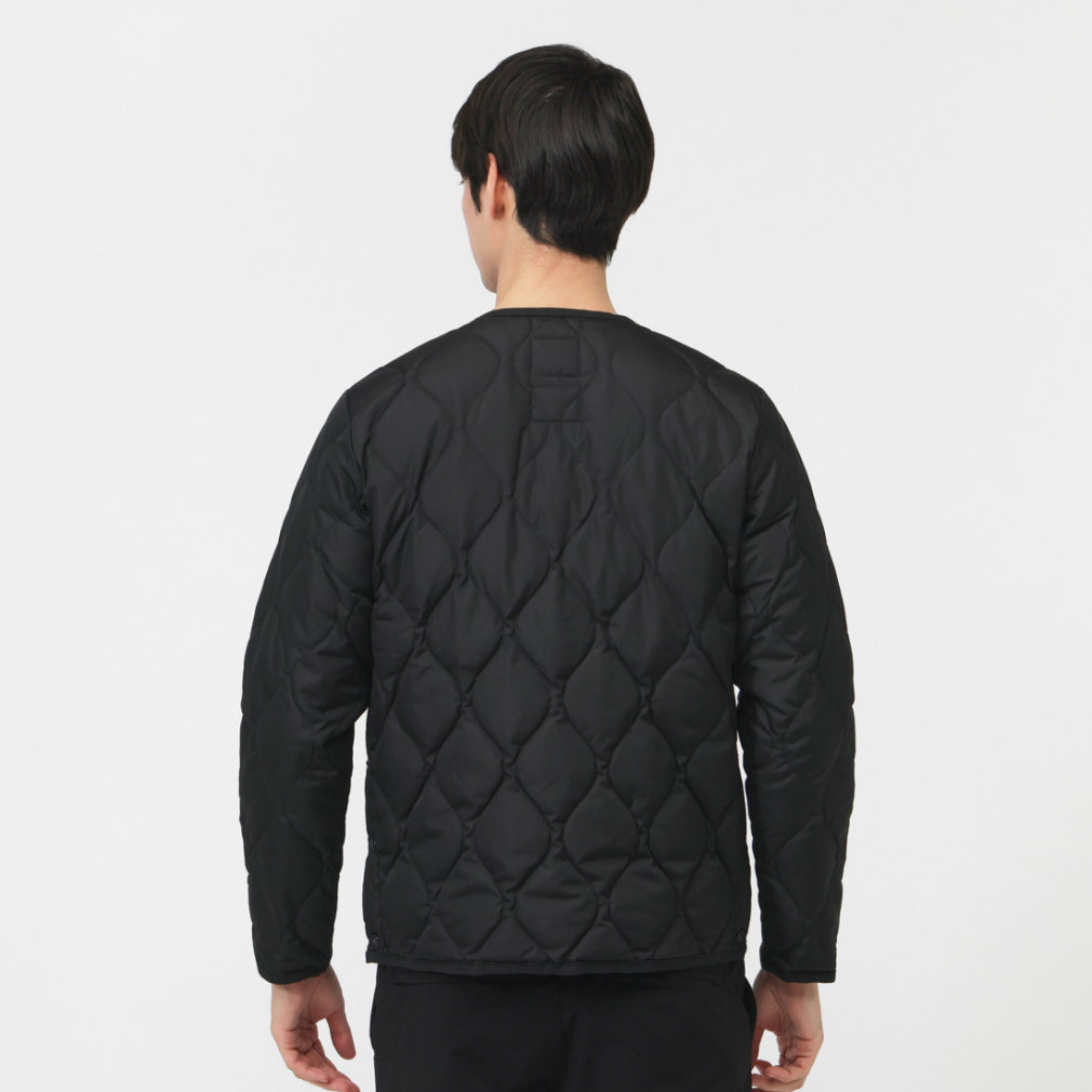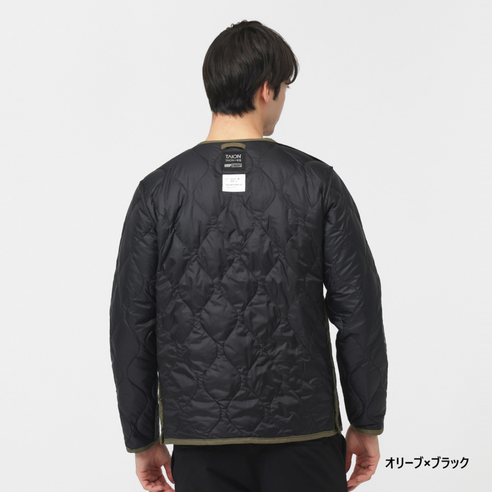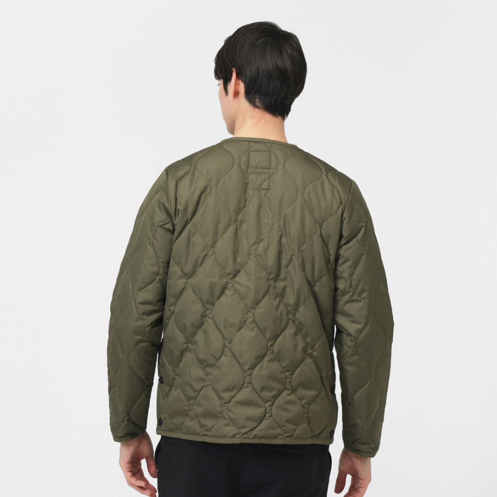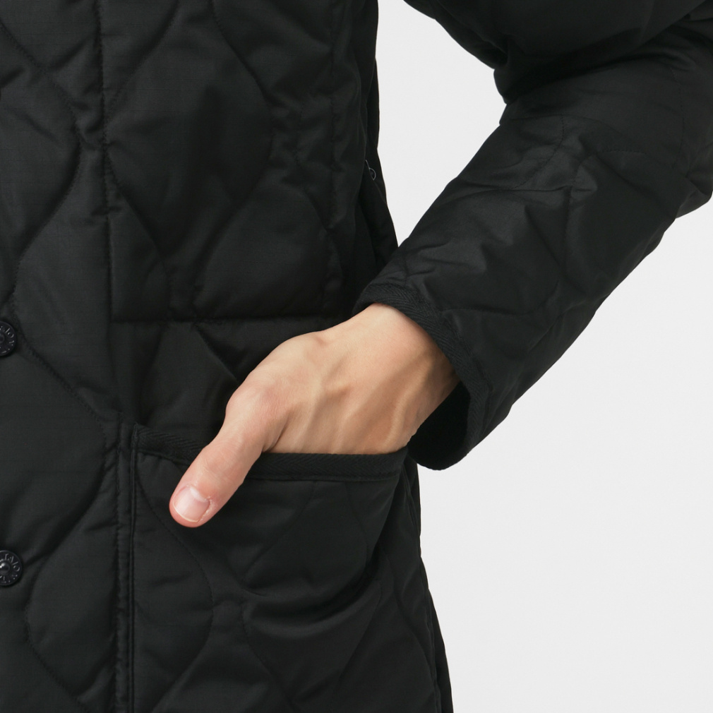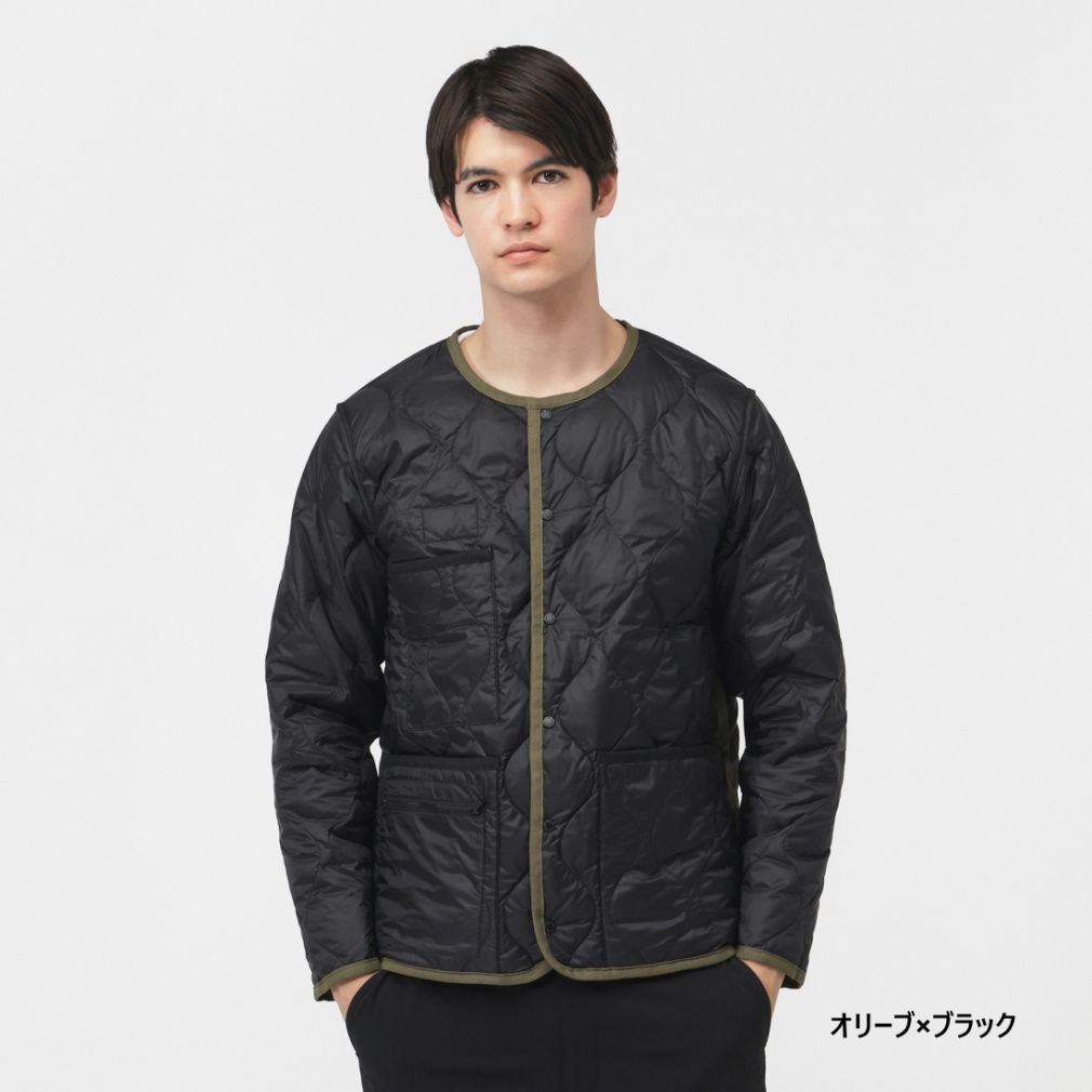 ◇ミリタリーテイストを落とし込んだノーカラーダウンジャケット。表生地はコットンライクな強度の高いリップストップ生地、裏地はしなやかなナイロンタフタ素材を使用。