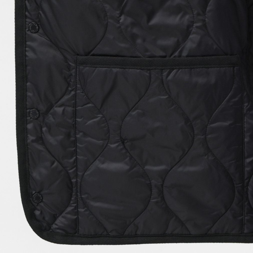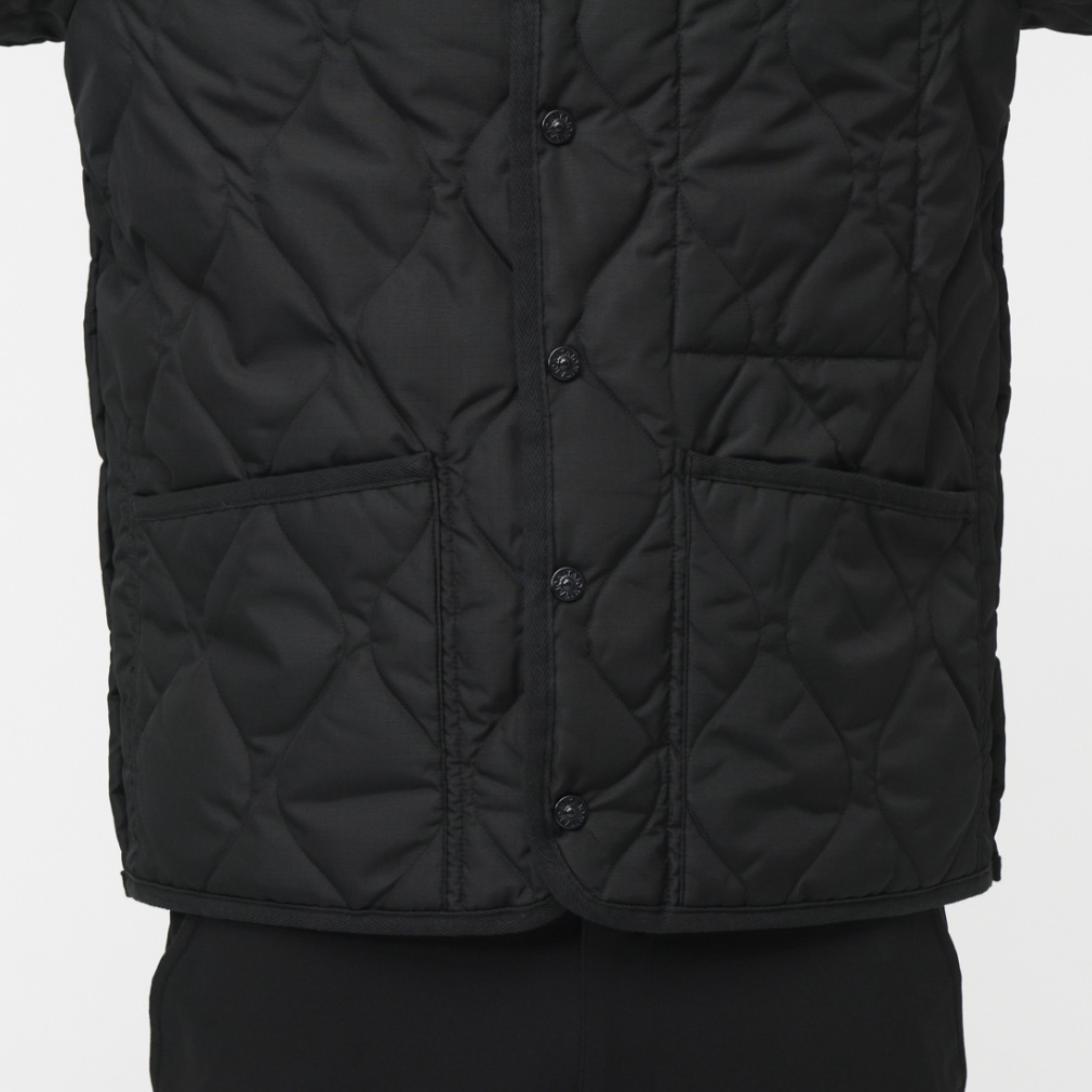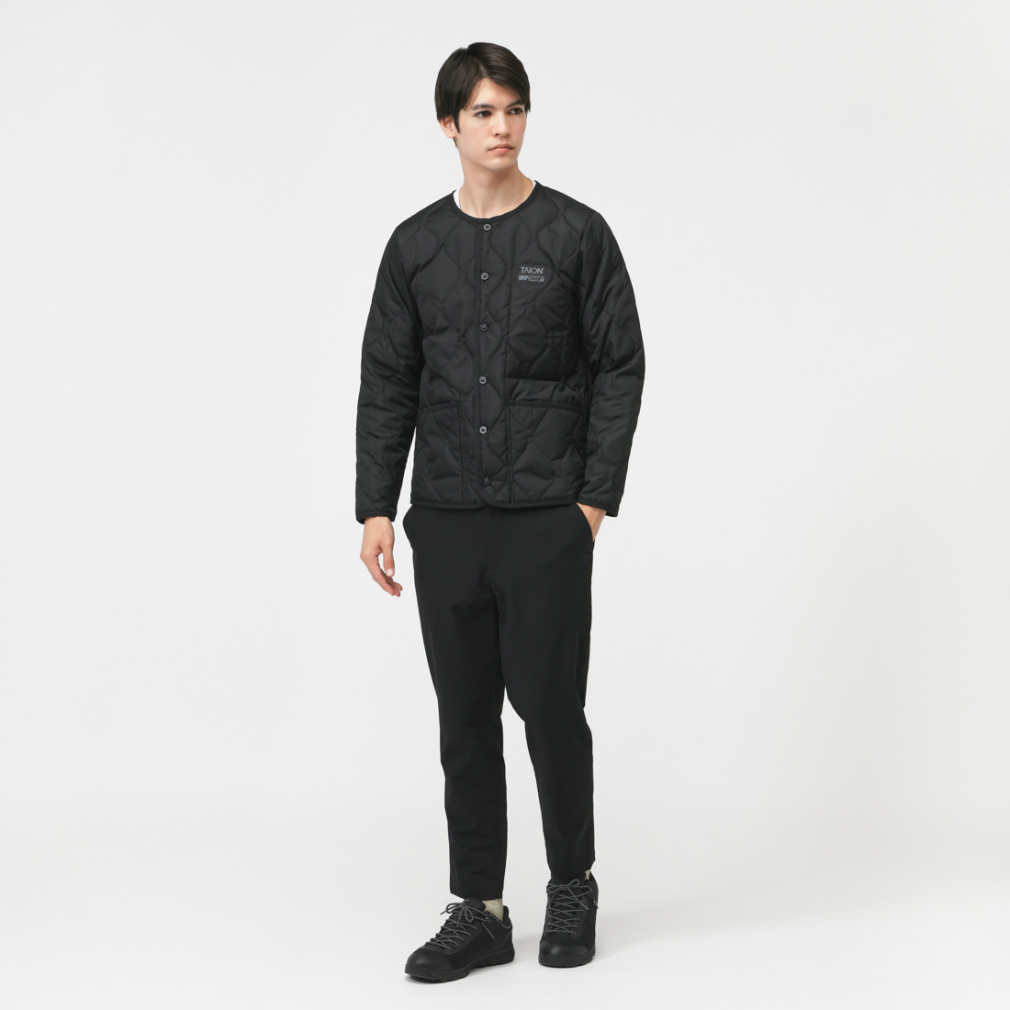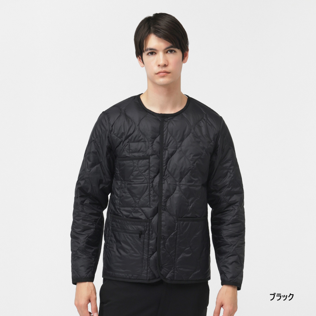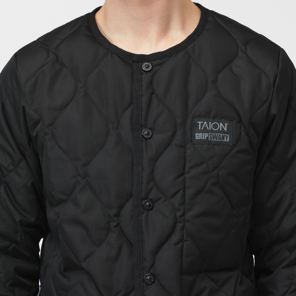 ◇ミリタリーテイストを落とし込んだノーカラーダウンジャケット。表生地はコットンライクな強度の高いリップストップ生地、裏地はしなやかなナイロンタフタ素材を使用。