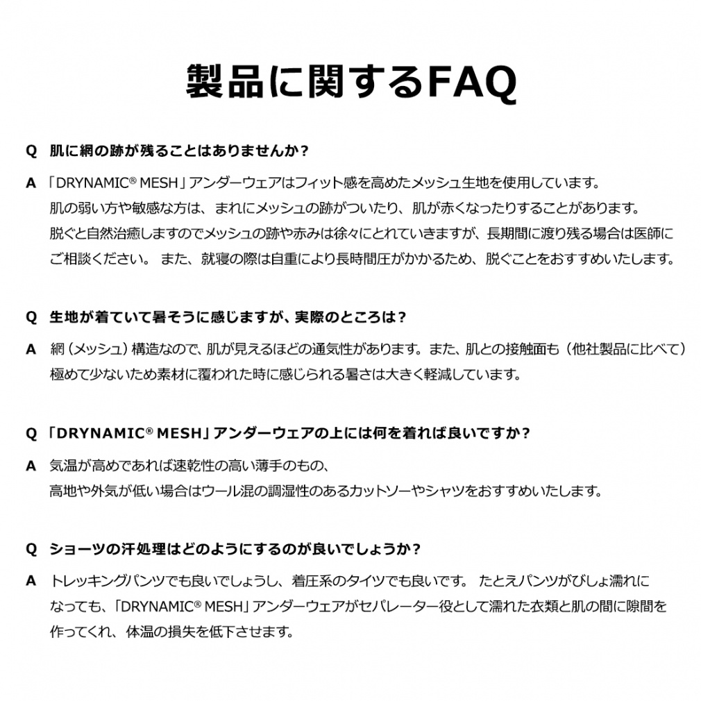 ◇一年を通して発汗による冷えと不快感を軽減する、究極のドライ感を実現した次世代のアンダーウェア(肌着)。外気温の影響を受けにくいポリプロピレンをベースに、かさ高メッシュで編み上げることで肌面の汗を素早く吸収し、上位のベースレイヤーに拡散します。さらに汗を吸ったベースレイヤーはメッシュの厚みによって肌から遠ざけられ、肌面の冷えを防ぎ、ドライ感を保ちます。気温の高い季節に最適な一分丈ショーツタイプ。