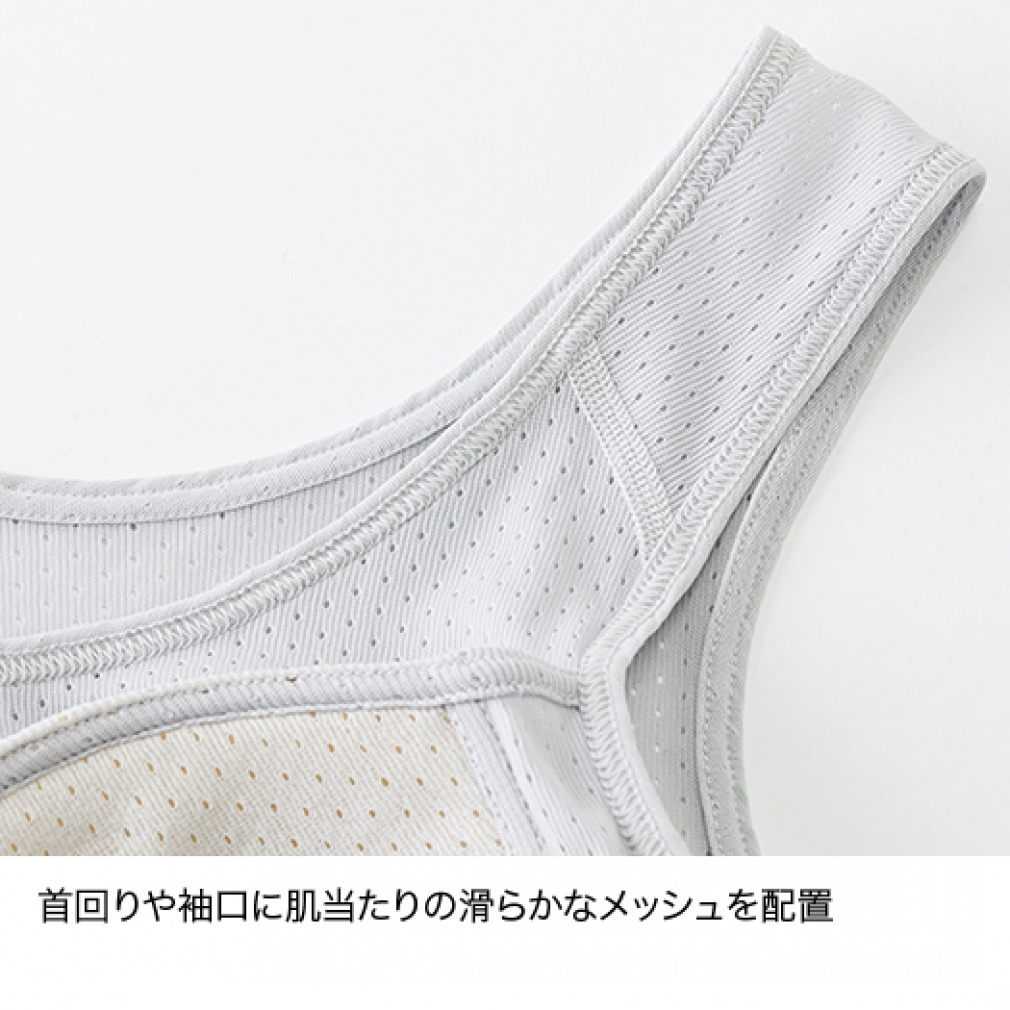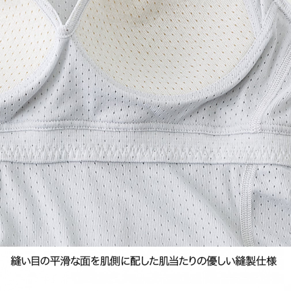 ◇バストの汗冷えやベタつきを軽減する、アウトドア女子のためのフィットブラです。独自開発の三層構造ブラカップは、優れた汗抜けとカップ自体が保水しないため、汗をかいてもひんやりとした冷えを感じにくく、汗だまりをしやすいアンダー部分には、汗抜けのいい柔らかなメッシュゴムを採用し、汗のニオイやベタツキを抑えます。柔らかなニットメッシュの本体と縫込みタイプのブラカップがバストの揺れに優しくフィットし、つけていることを忘れるストレスフリーなつけ心地です。