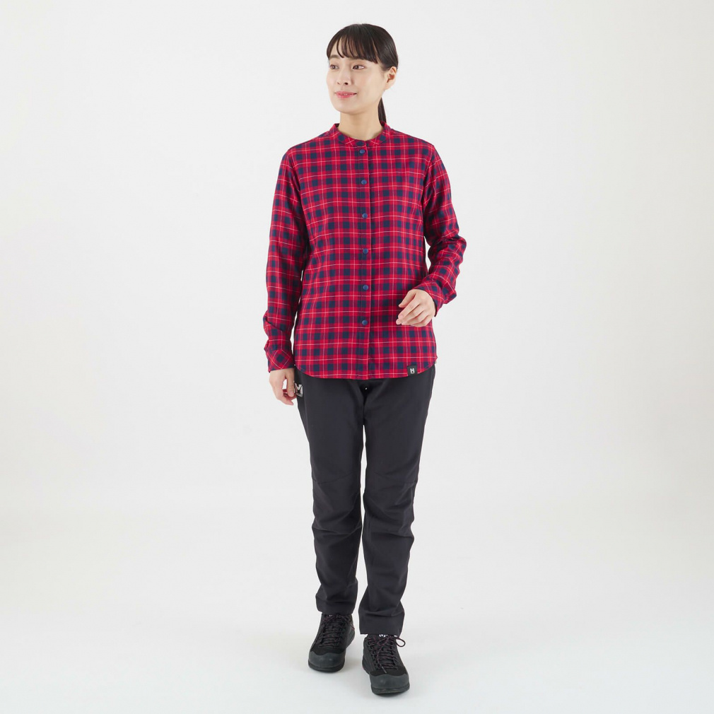 ◇秋冬のトレッキングからキャンプまで様々なフィールドで使いやすい、軽量で暖かいフランネルシャツ。首回りがスッキリとしたスタンドカラータイプです。中空糸構造のポリエステル糸サーモライトを採用し、厚手で十分な保温性を備えながら、見た目以上の軽さを実現しました。肩は中綿入りのキルト仕様になっており、バックパックを背負った際のクッション性を考慮しています。