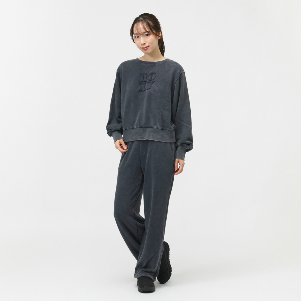 ◇シルエットを変化させ、2WAYで着用できるウォッシュ加工を施したスウェットパンツ。ウエストはゴムとひもの仕様。裾にゴムのアジャスターをつけているので、シルエットを変化させ2WAYで着用できるのが特徴。ヒップにはROXYロゴのパッチワークをあしらいました。
