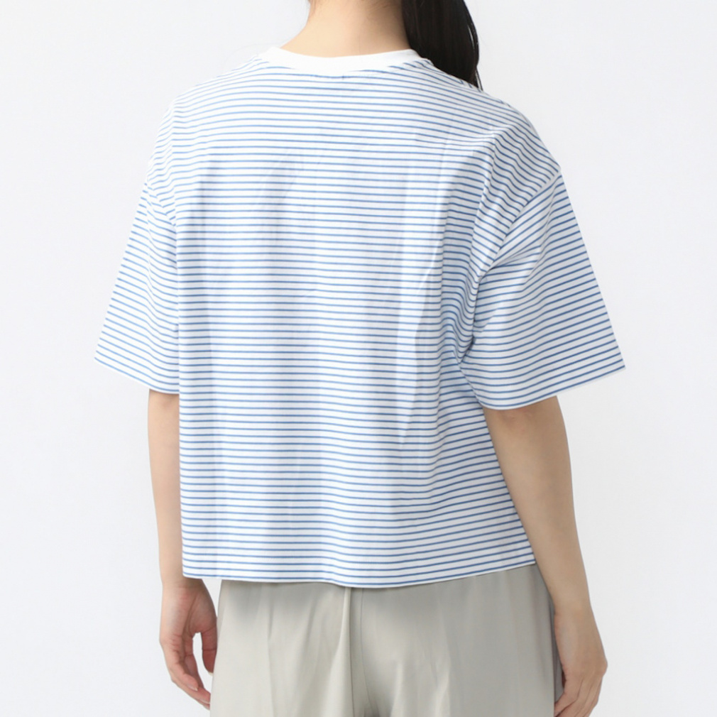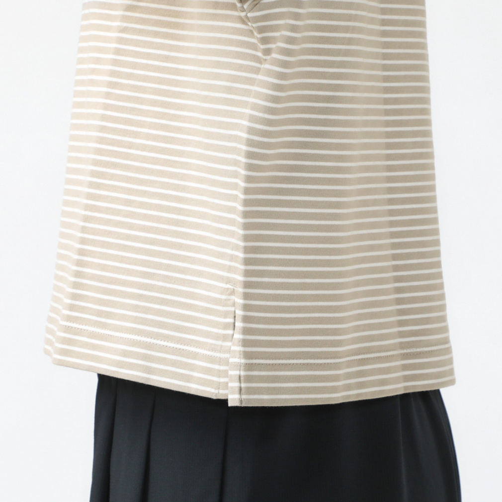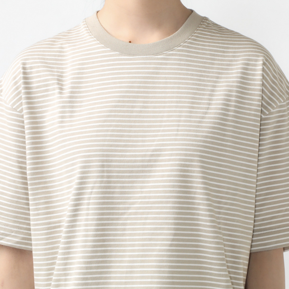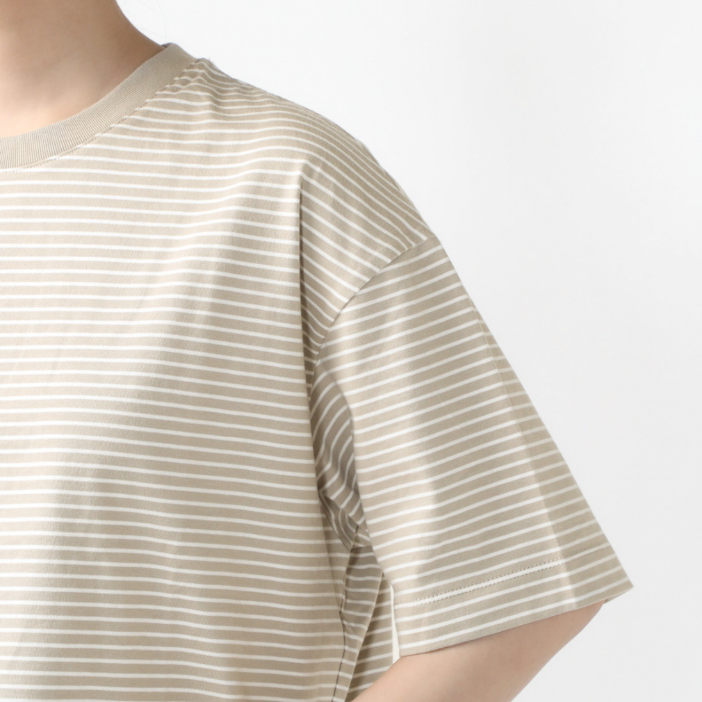 ◇定番のコットンTシャツを今シーズンは価格を見直し、更にお安くお求めいただけるようになりました。上質なUSAコットンを特殊なコンパクト紡績した糸を使用。さらに通常よりハイゲージに編立てることでさらに表面の毛羽を抑え、つるっとした肌触りと上品さを実感できます。UVカット機能を施し、気になる紫外線対策も。24SSはオーバーサイズシルエットに細めのボーダーTシャツで、定番のベージュ・ブラック、さわやかなブルーとグリーンの4色展開。ボーダーTシャツが1枚あると夏のコーディネートの幅はぐっと広がります!