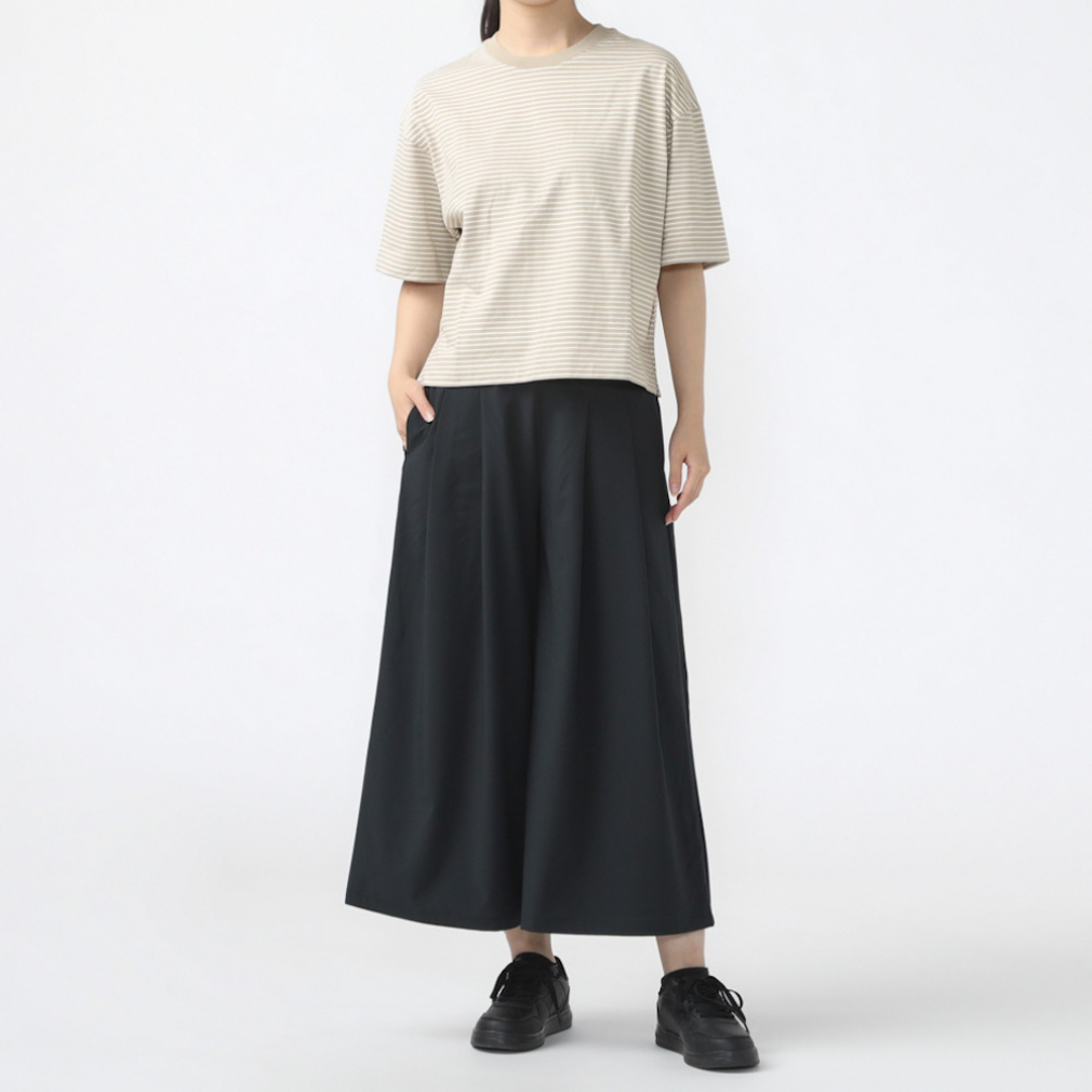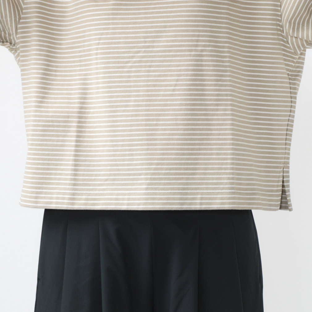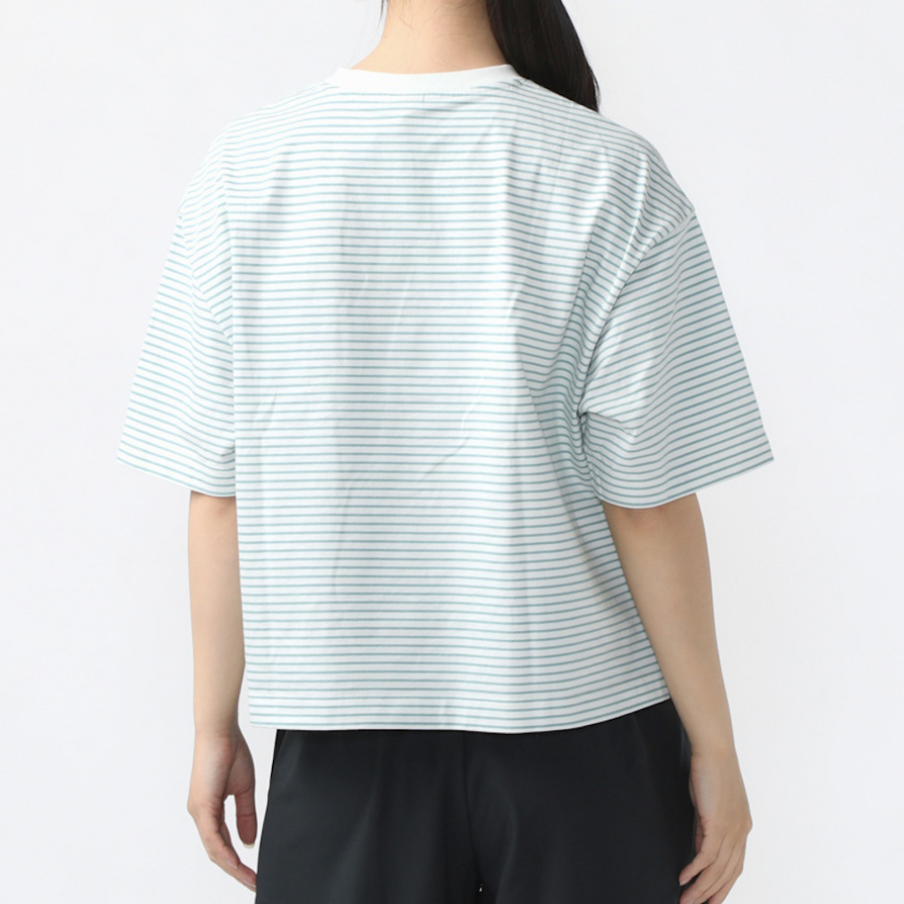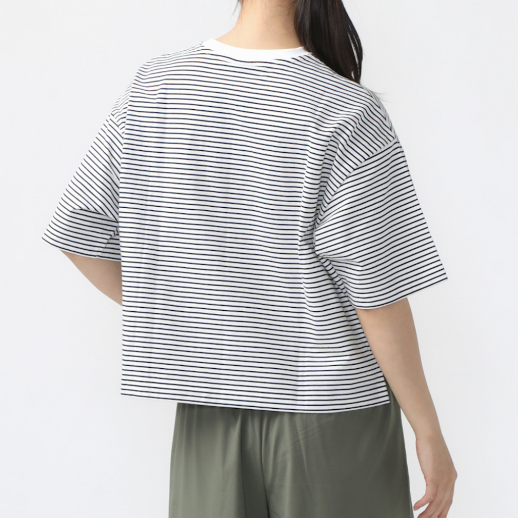 ◇定番のコットンTシャツを今シーズンは価格を見直し、更にお安くお求めいただけるようになりました。上質なUSAコットンを特殊なコンパクト紡績した糸を使用。さらに通常よりハイゲージに編立てることでさらに表面の毛羽を抑え、つるっとした肌触りと上品さを実感できます。UVカット機能を施し、気になる紫外線対策も。24SSはオーバーサイズシルエットに細めのボーダーTシャツで、定番のベージュ・ブラック、さわやかなブルーとグリーンの4色展開。ボーダーTシャツが1枚あると夏のコーディネートの幅はぐっと広がります!
