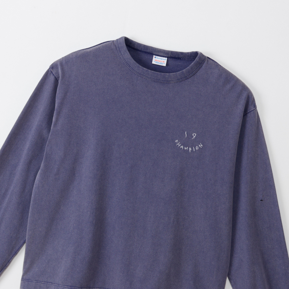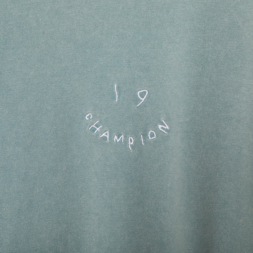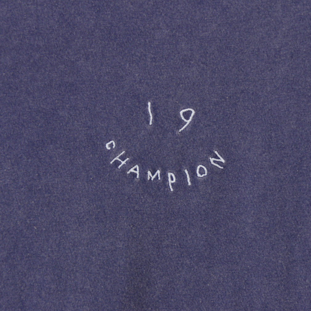 左胸に小さな子の落書きを思わせるハンドライティングタッチで「19 CHAMPION」と刺繍しています。