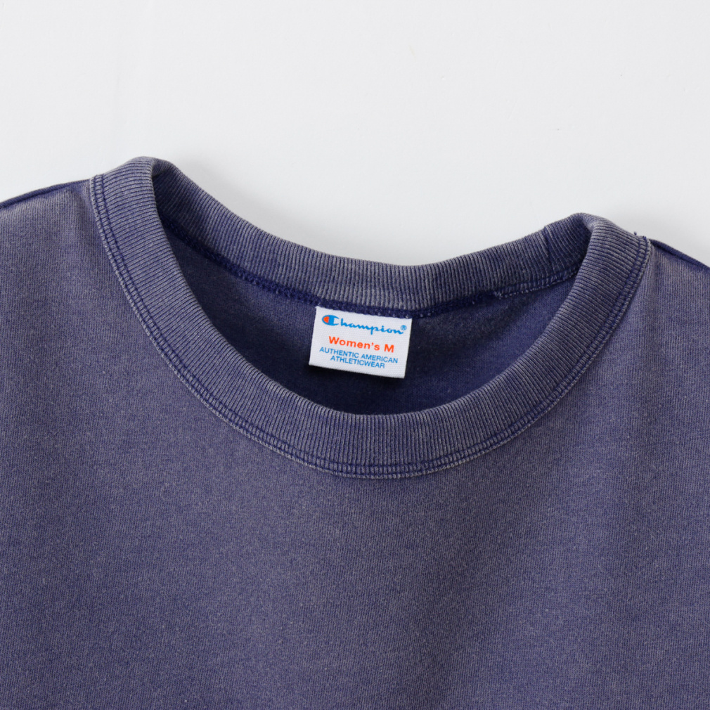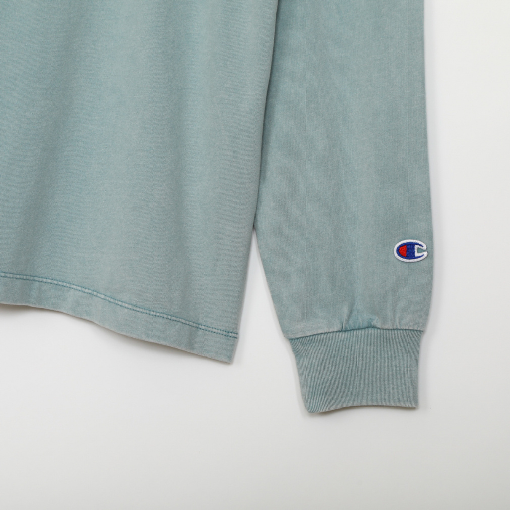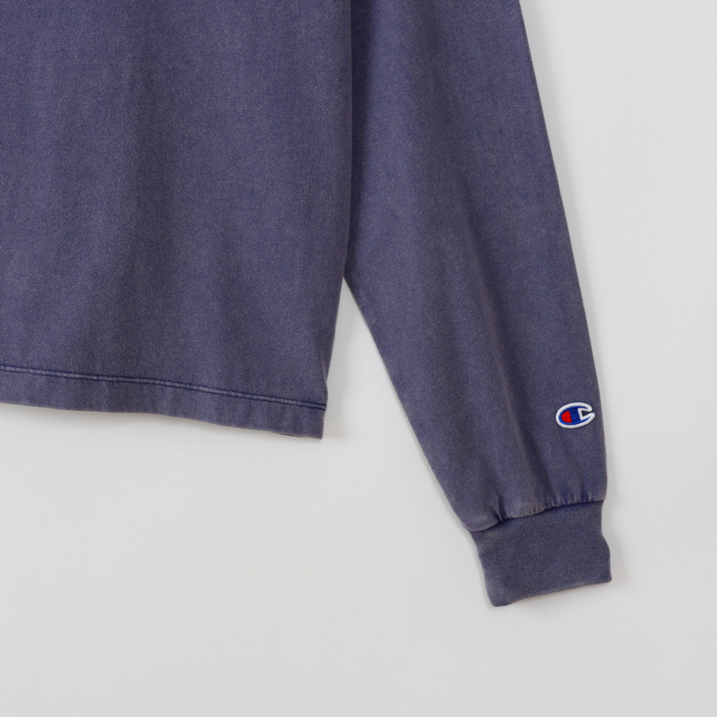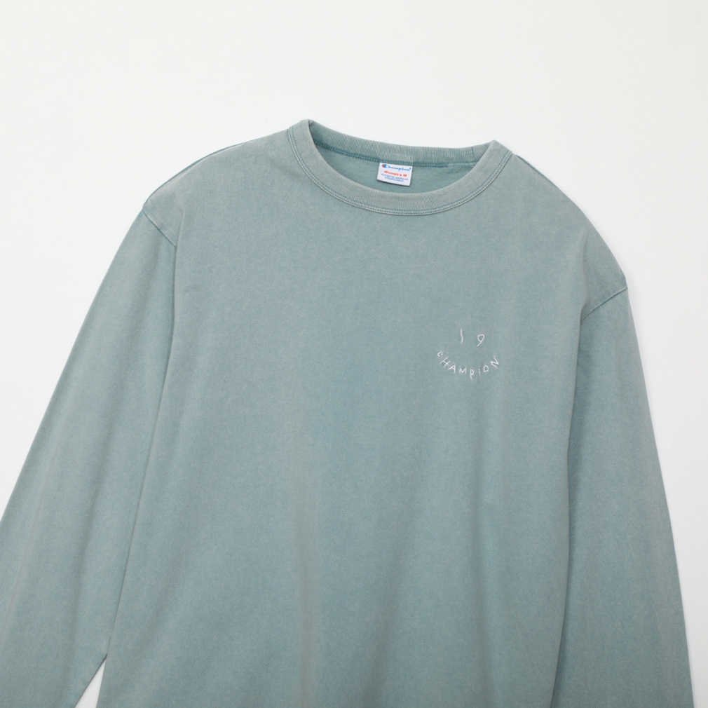 左胸に小さな子の落書きを思わせるハンドライティングタッチで「19 CHAMPION」と刺繍しています。