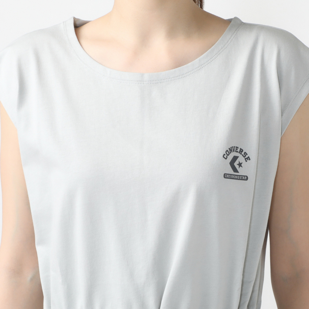 ◇上質なコットン素材を使用したノースリーブのワンピース。ウエストに配したドローコードにより自分らしく着用感を調整することが可能です。首周りは程よく設計されており、クラシックなアーチ状のロゴデザインが左胸に配置されています。