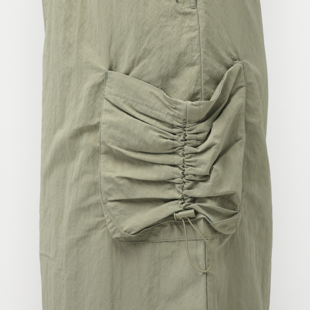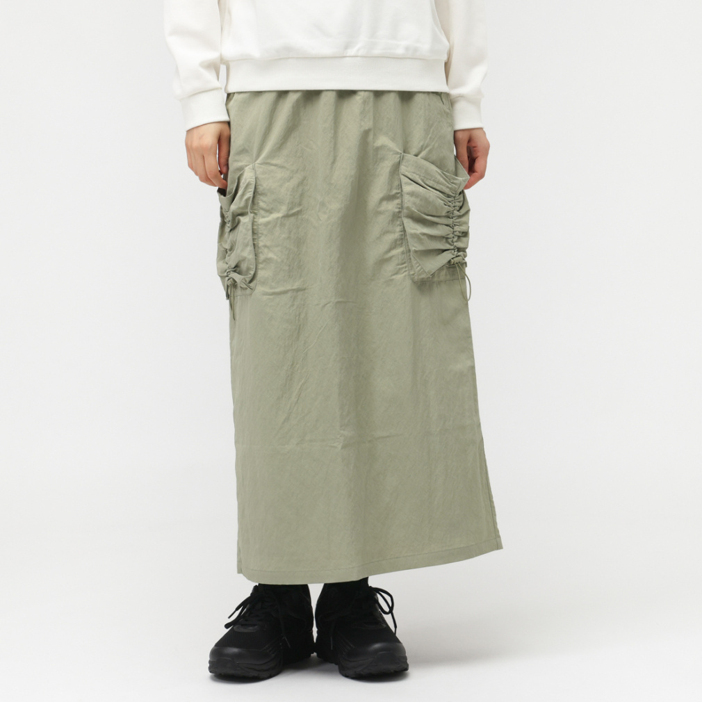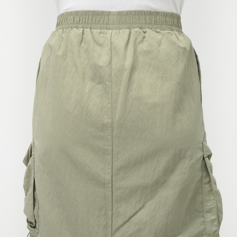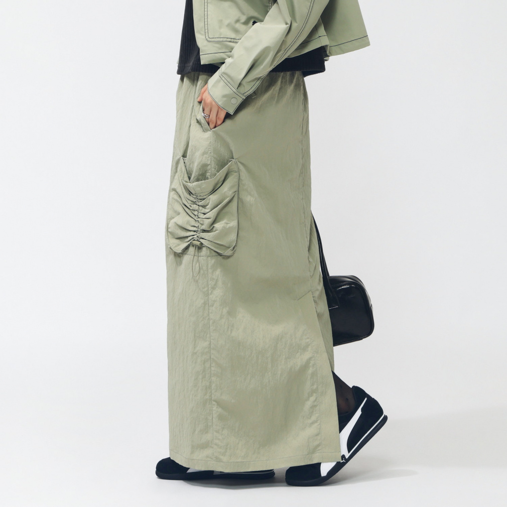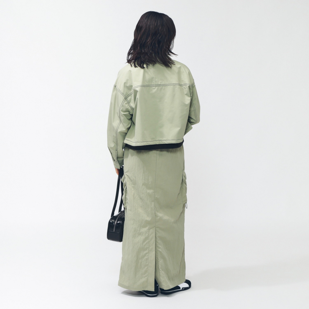 AUTUMNコレクションから、ナイロンのウーブン素材を使用したロングスカート。