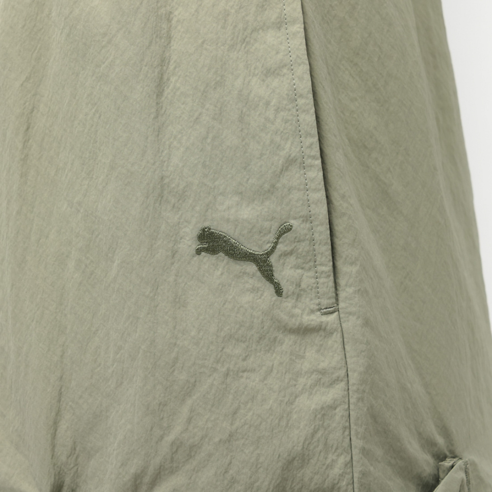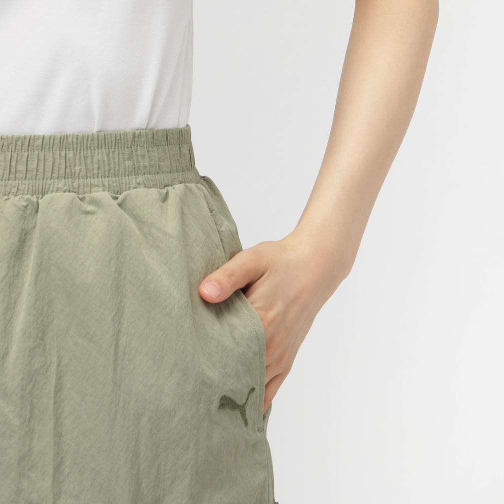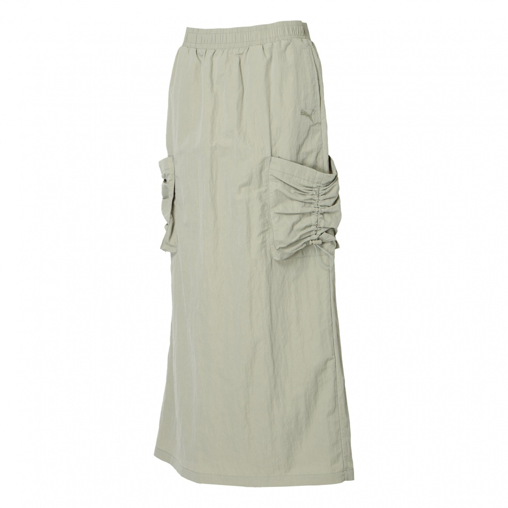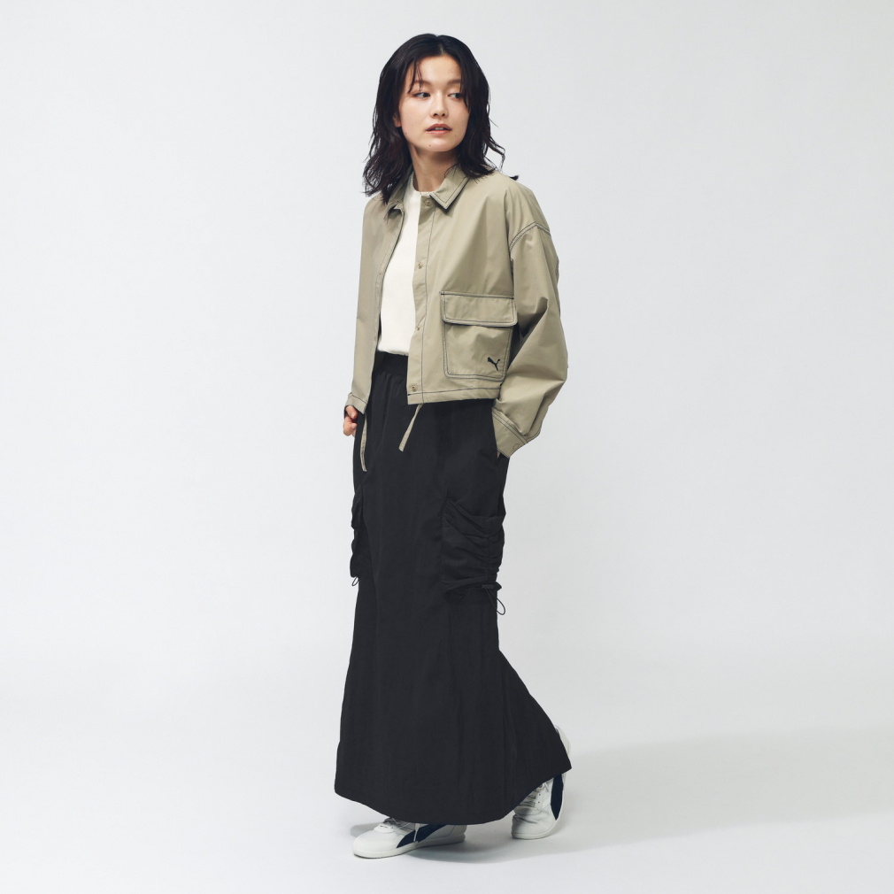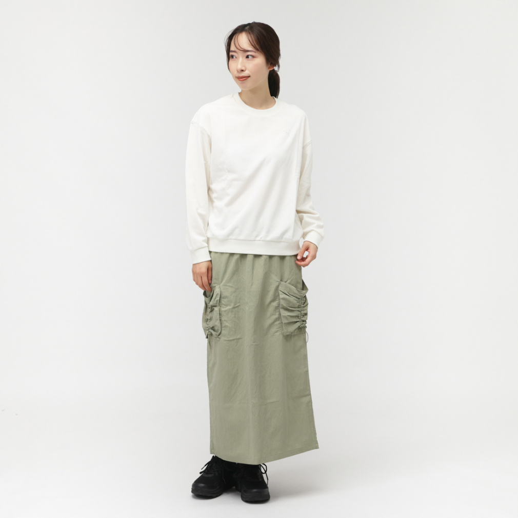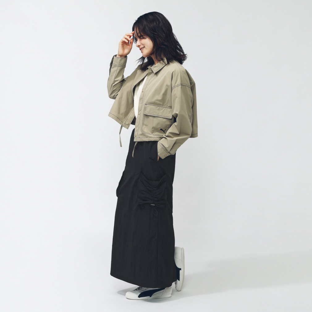 AUTUMNコレクションから、ナイロンのウーブン素材を使用したロングスカート。