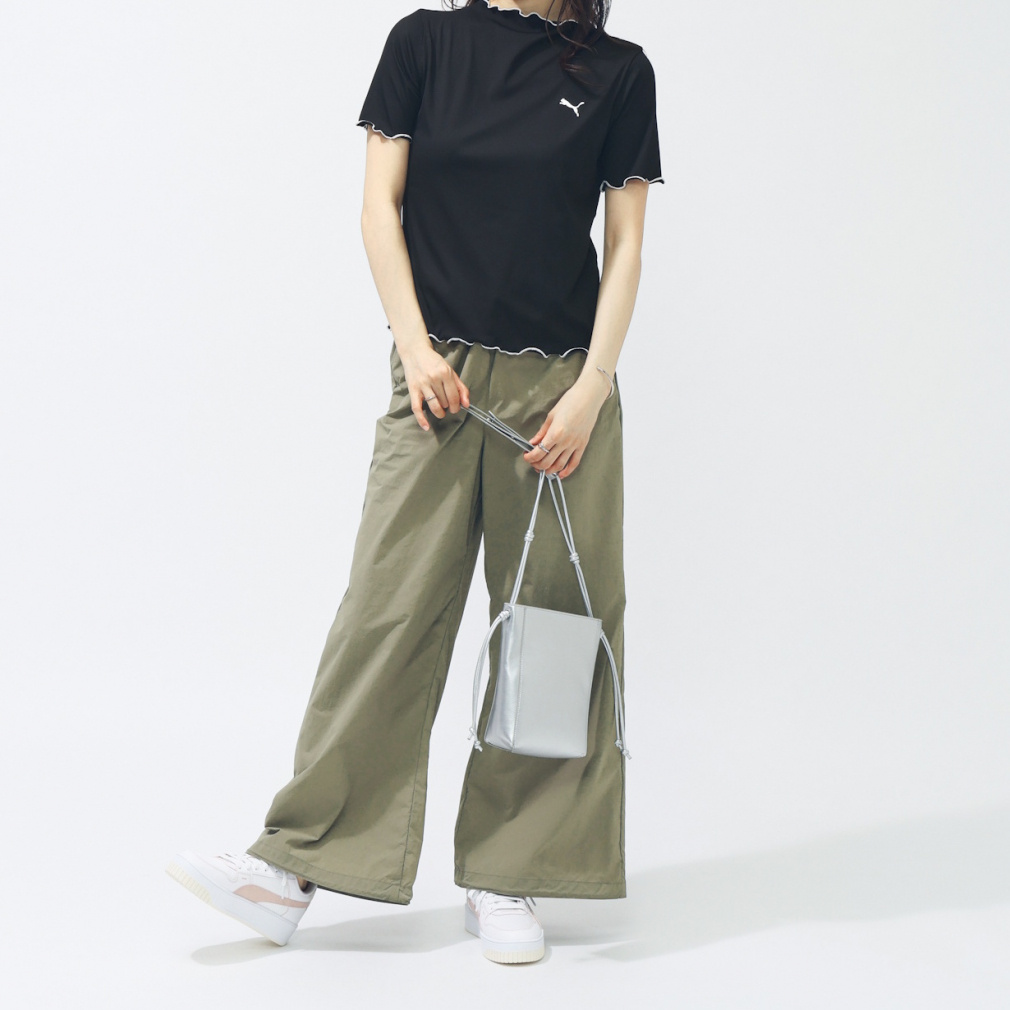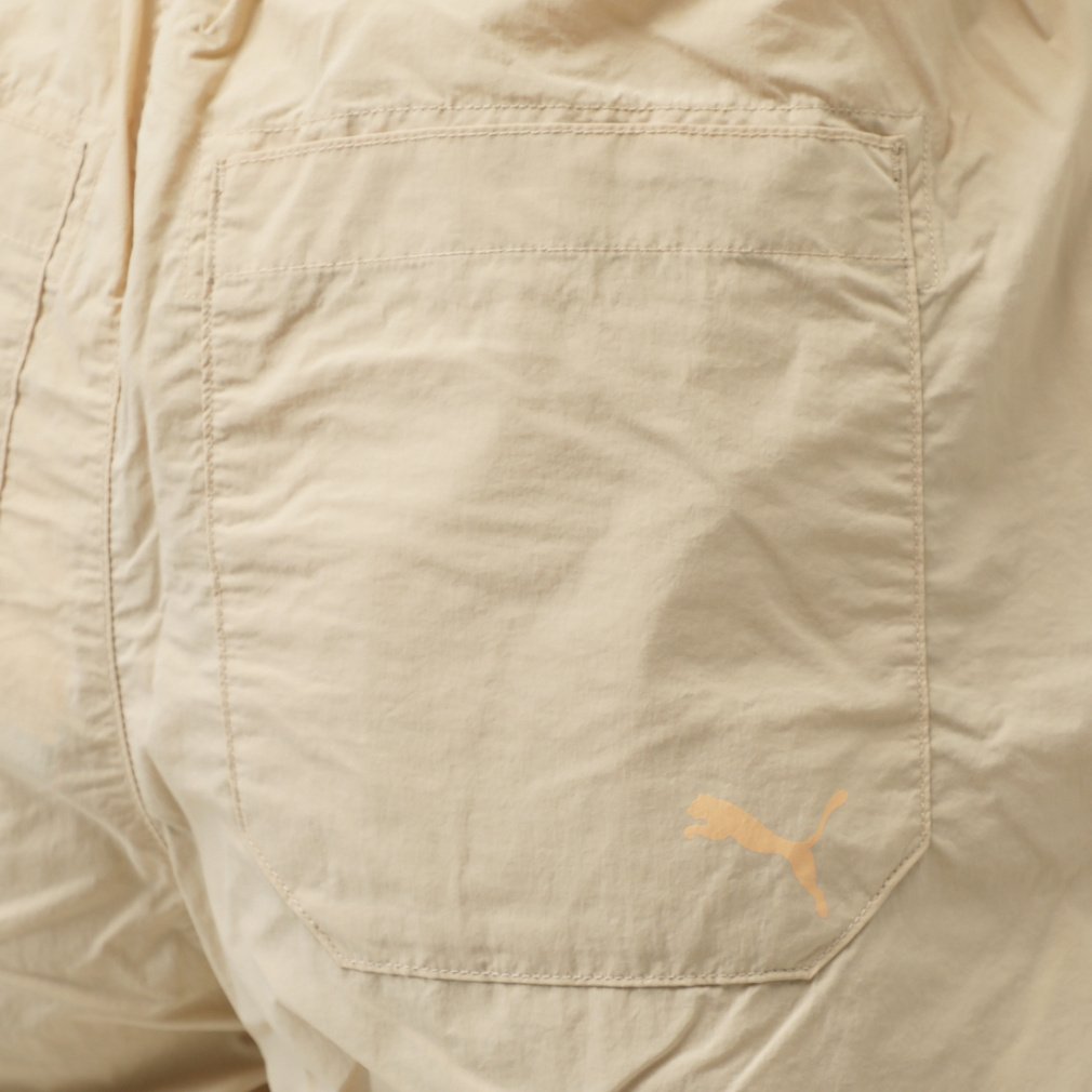 裾のドローコードを調整することで、パラシュートパンツとしてもスタイリングを楽しめます。