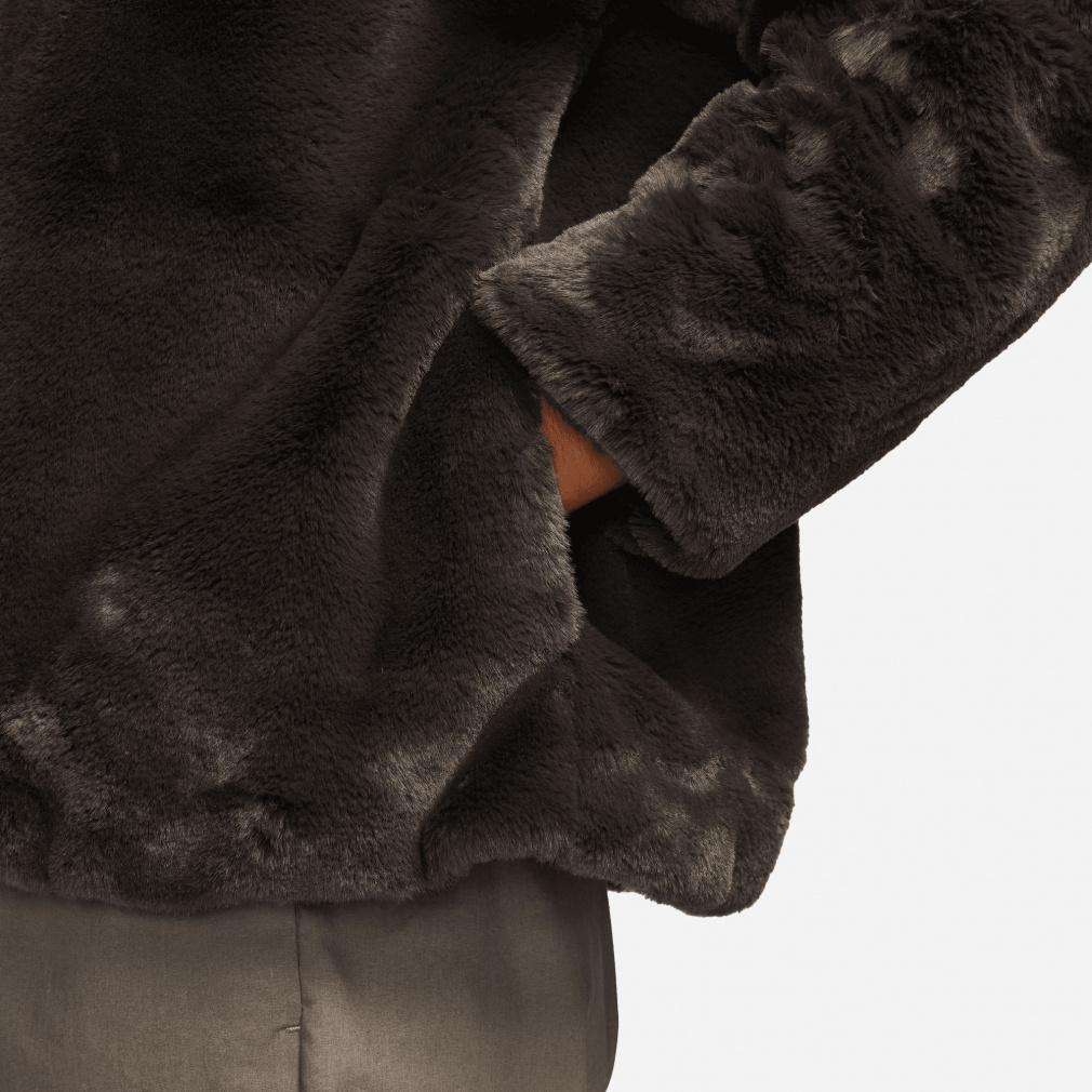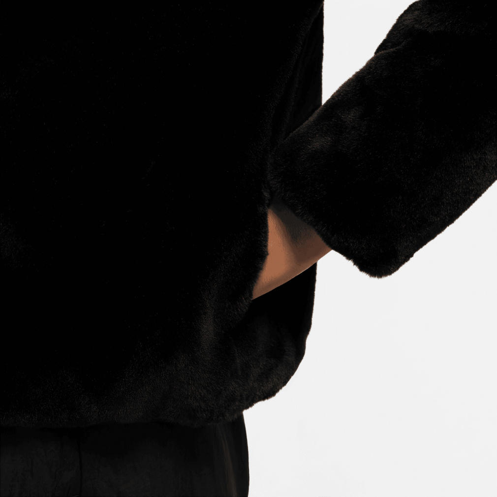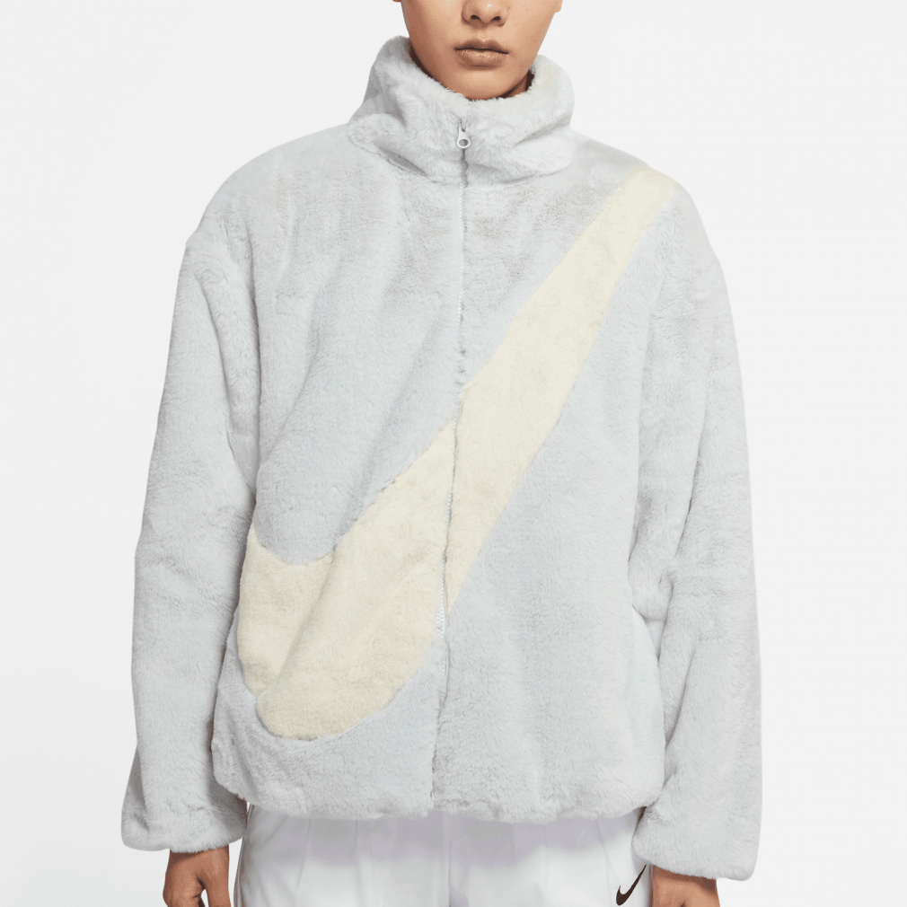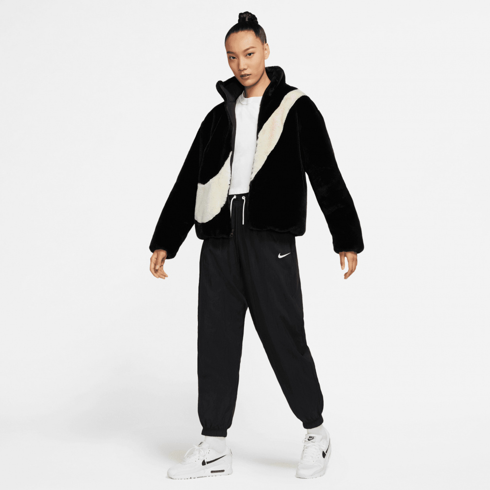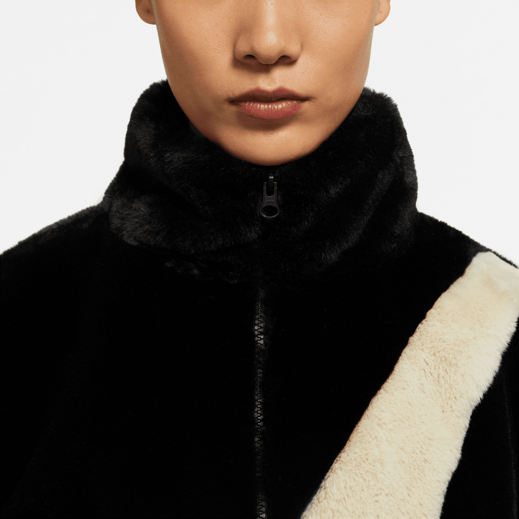 ◇暖かいフェイクファージャケットに、存在感のある大きめのスウッシュロゴをプラス。