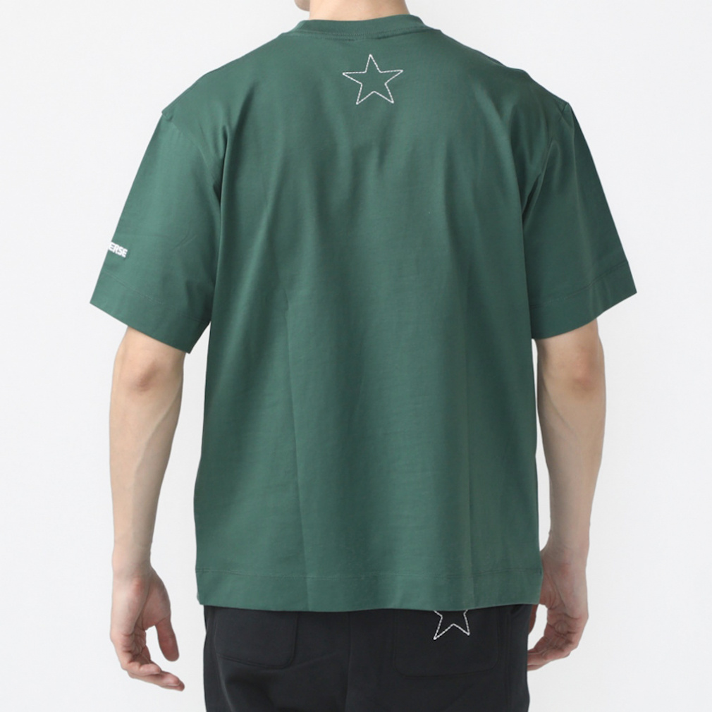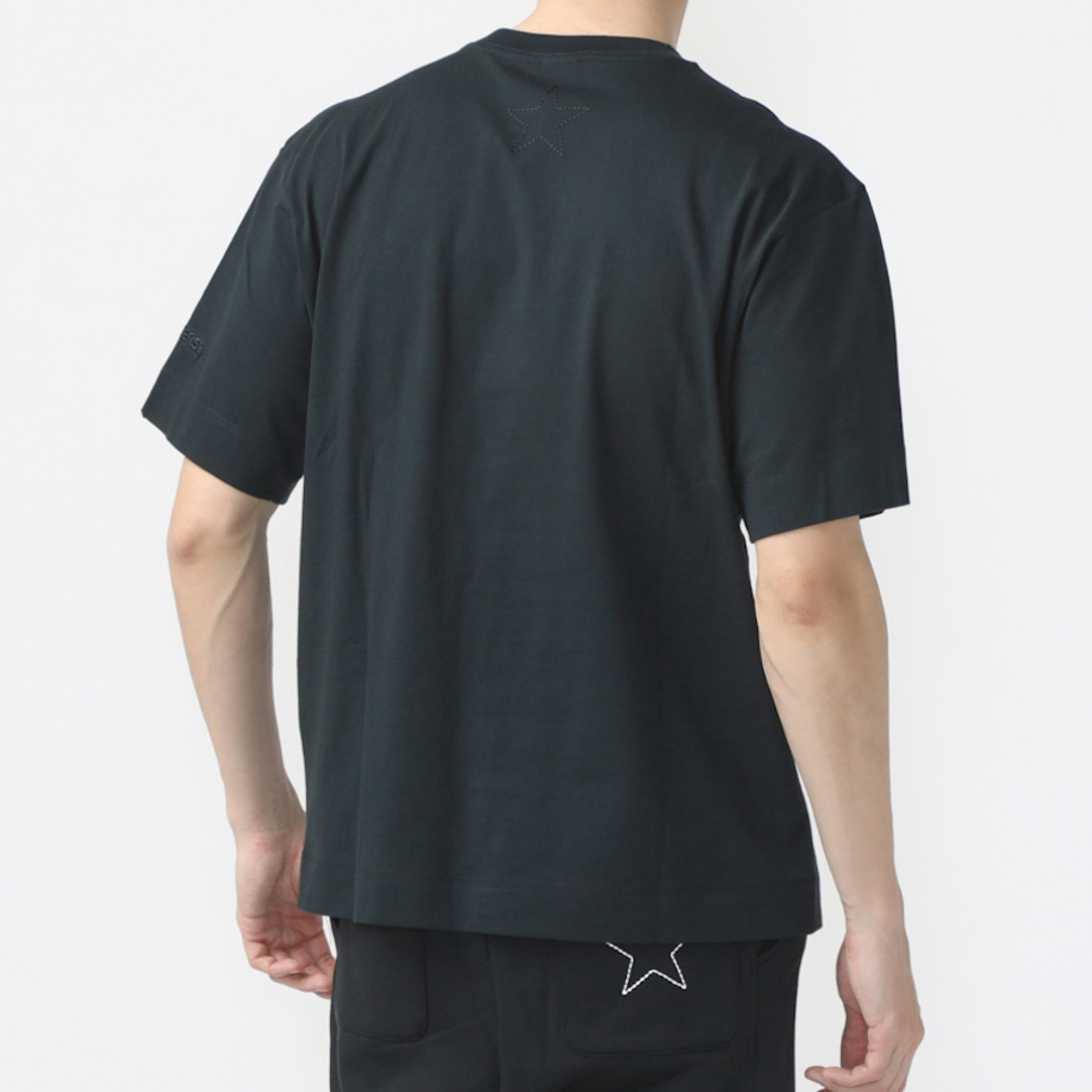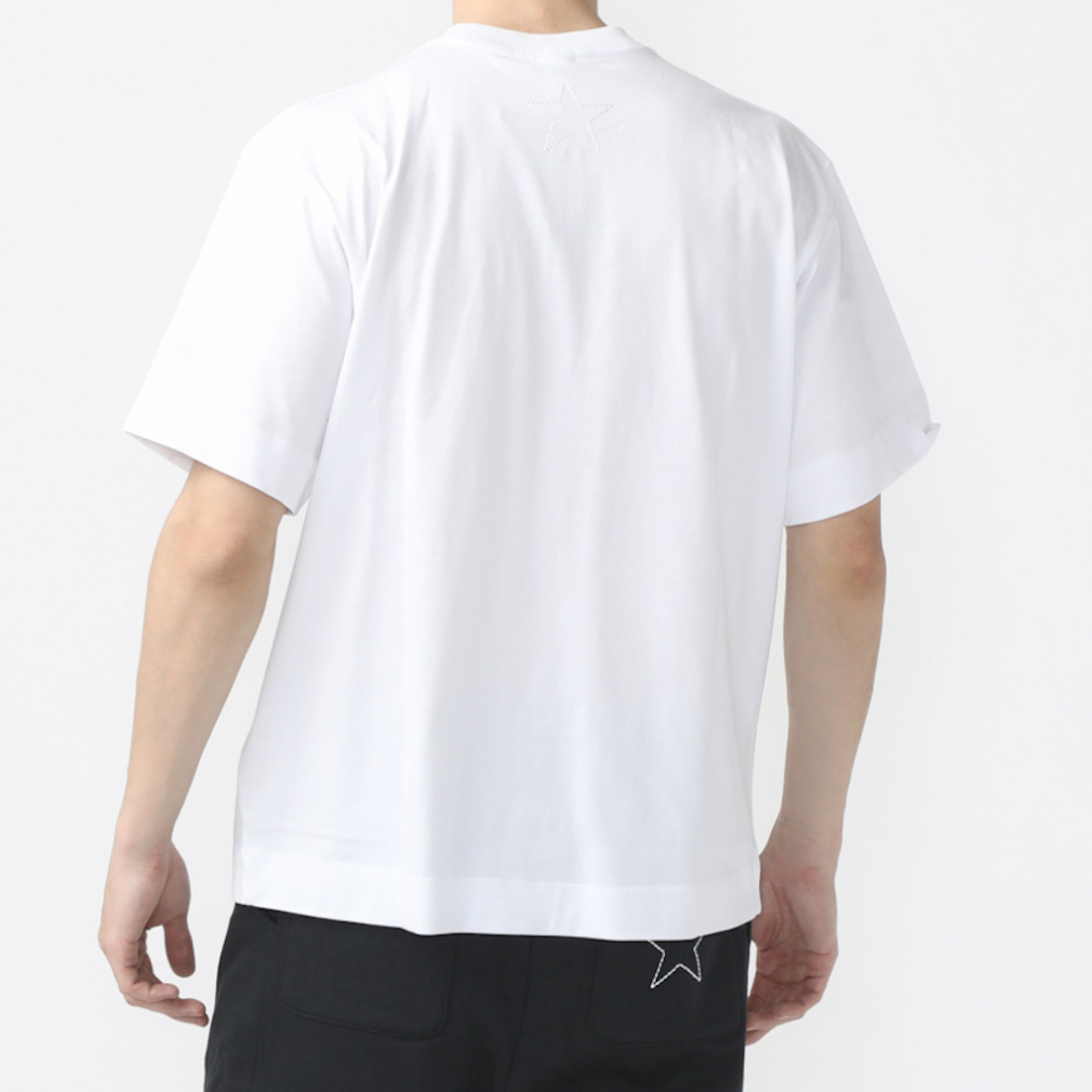 ◇しっかりしたコットン100%素材の半袖のポケットTシャツ。わきの下のアイレット刺繍や、太くとった袖口や裾の折り返しなど上質感のあるデザインが特長です。後身頃に配置されているステッチ風のスター刺繍がアクセントとなっています。モノの出し入れがしやすいようにポケット口は斜めにカットされています。