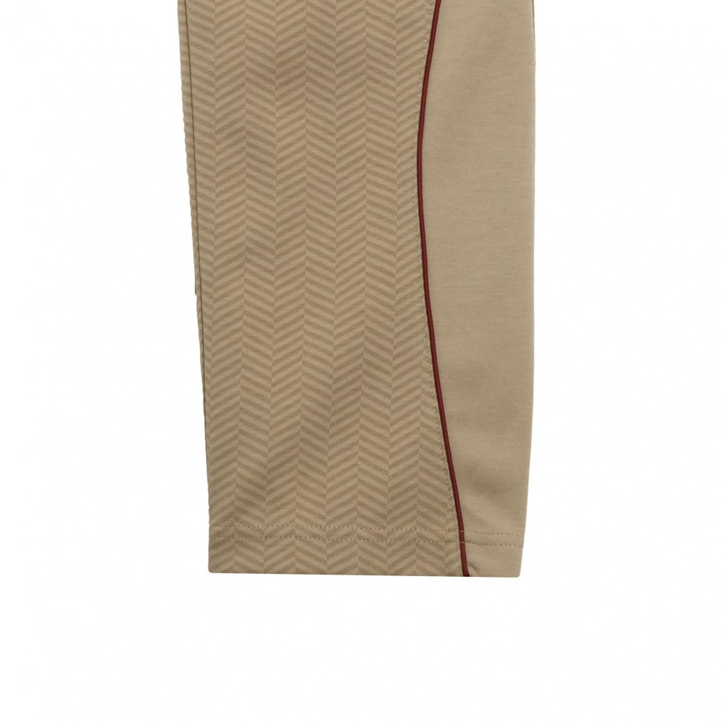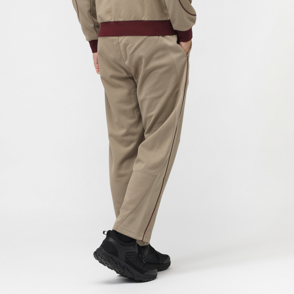 トレンドのヘリンボーン柄をオリジナルのオールオーバープリントにし、ソリッドの生地を組み合わせたリラックスフィットのパンツで、パイピングを施したカーブラインがアクセント。
