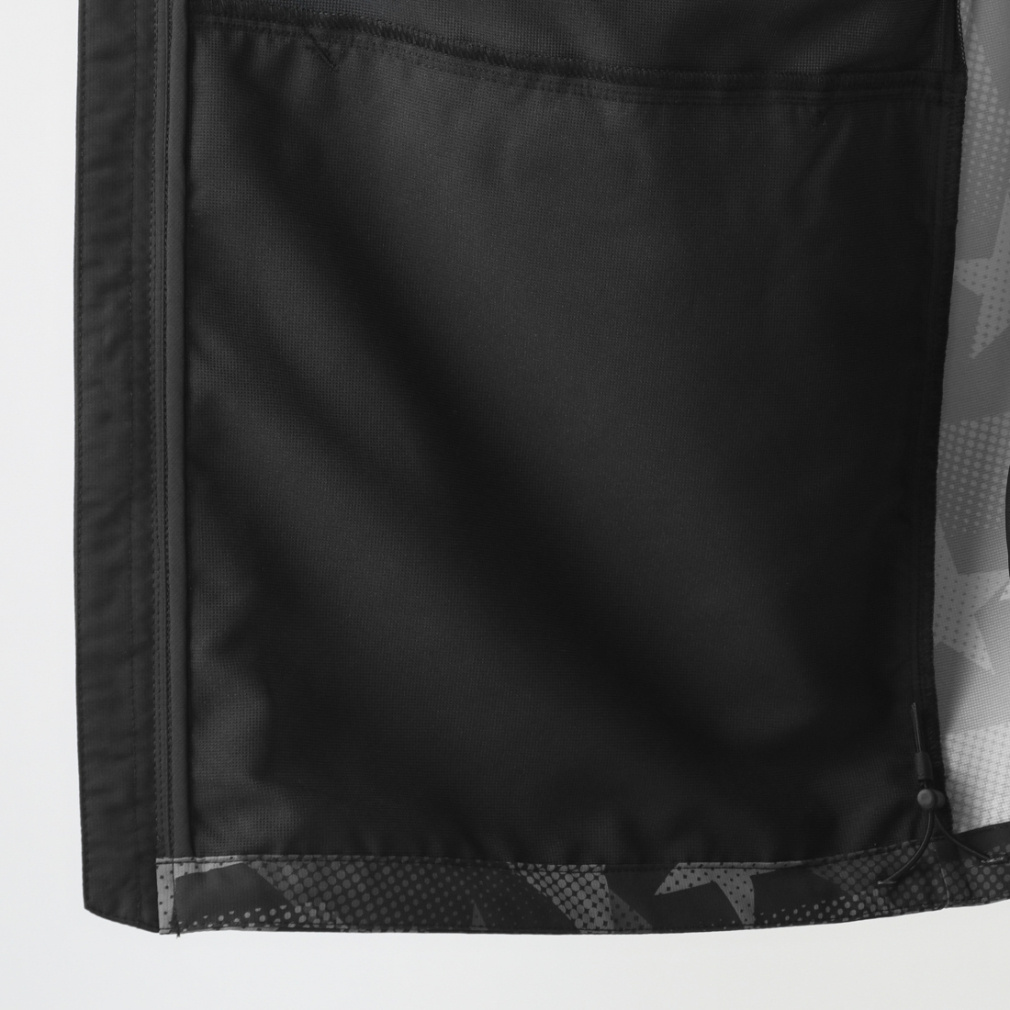 ◇撥水性のある2重織り素材を使用したジップアップのウーブンジャケット。ウエストで切り替えたシーズナルグラフィックが特長です。フードは衿に収納が可能で急な雨などにも対応でき、背中にはベンチレーションがあり衣類内の蒸れも軽減します。裾に配したドローコードでシルエットの調整や風の侵入を防ぐことが可能です。
