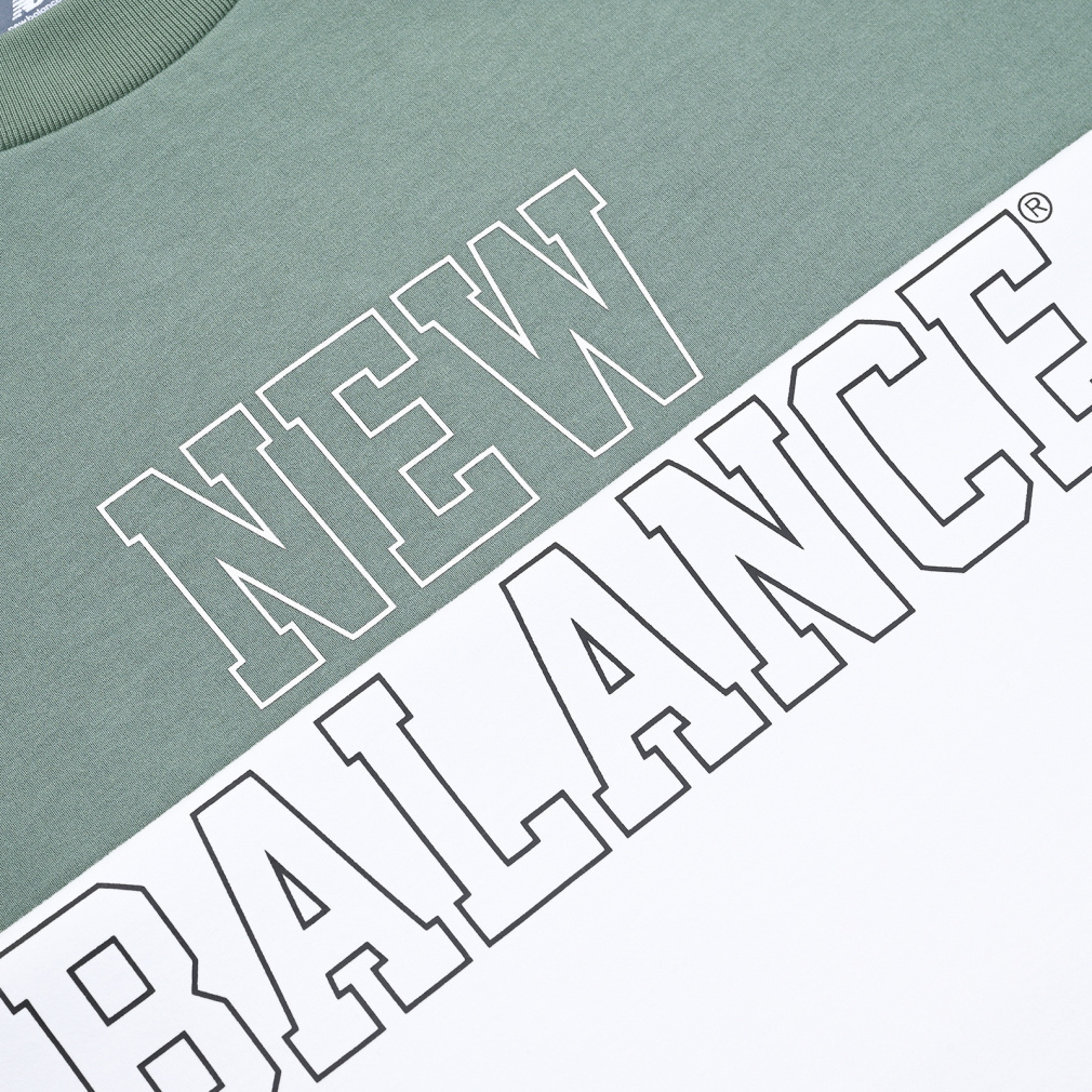 フロントのブロックタイプのNBロゴプリントと、左裾のピスネームタグがデザインのアクセントに。