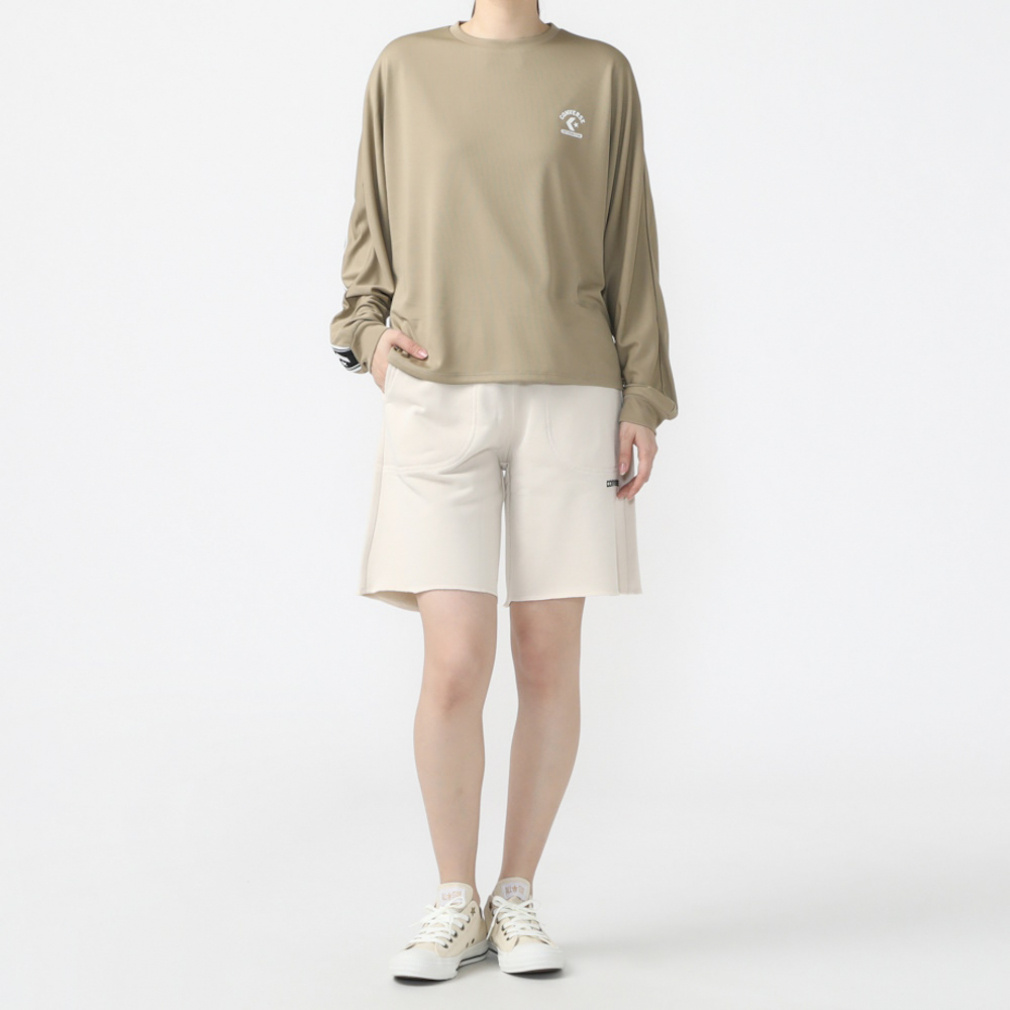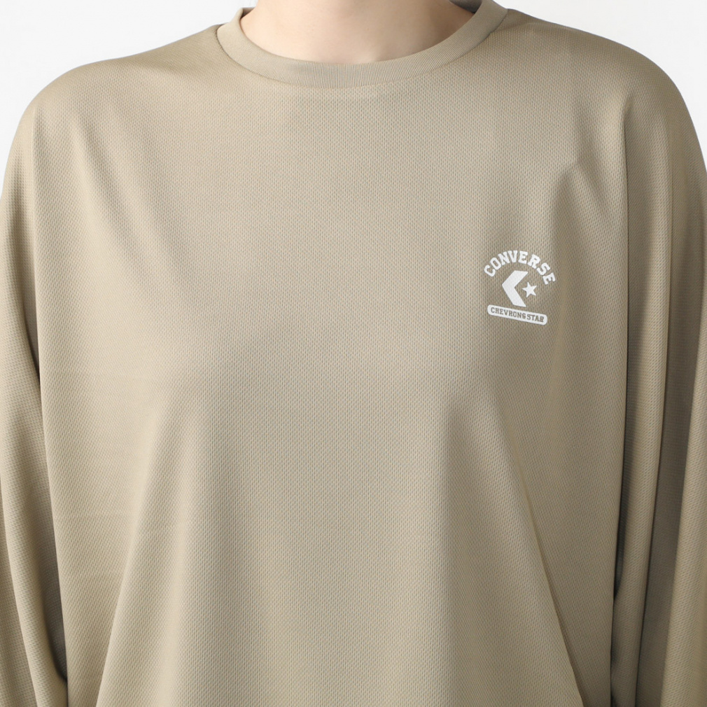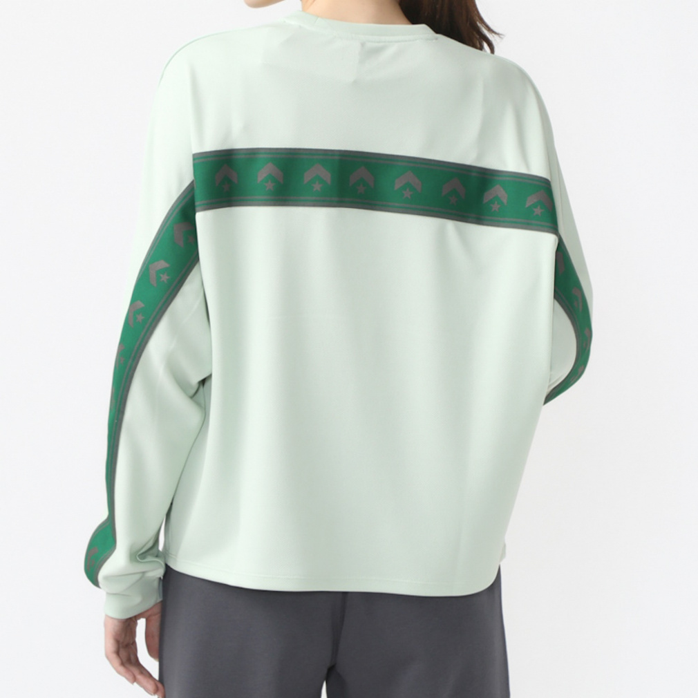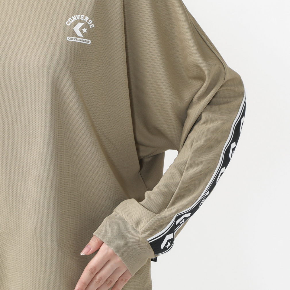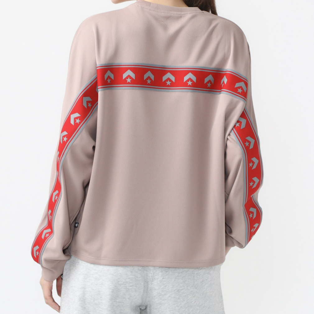 ◇袖から背中にかけてシェブロン&スターロゴのテープを配した長袖のTシャツ。吸汗速乾素材を採用し、左胸にクラシックなアーチ状のロゴデザインが配置されています。ゆったりとしたサイズ感で動きやすい構造が特長です。