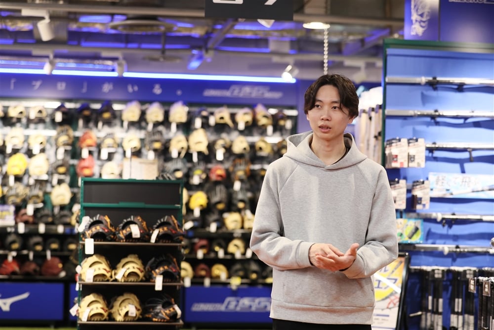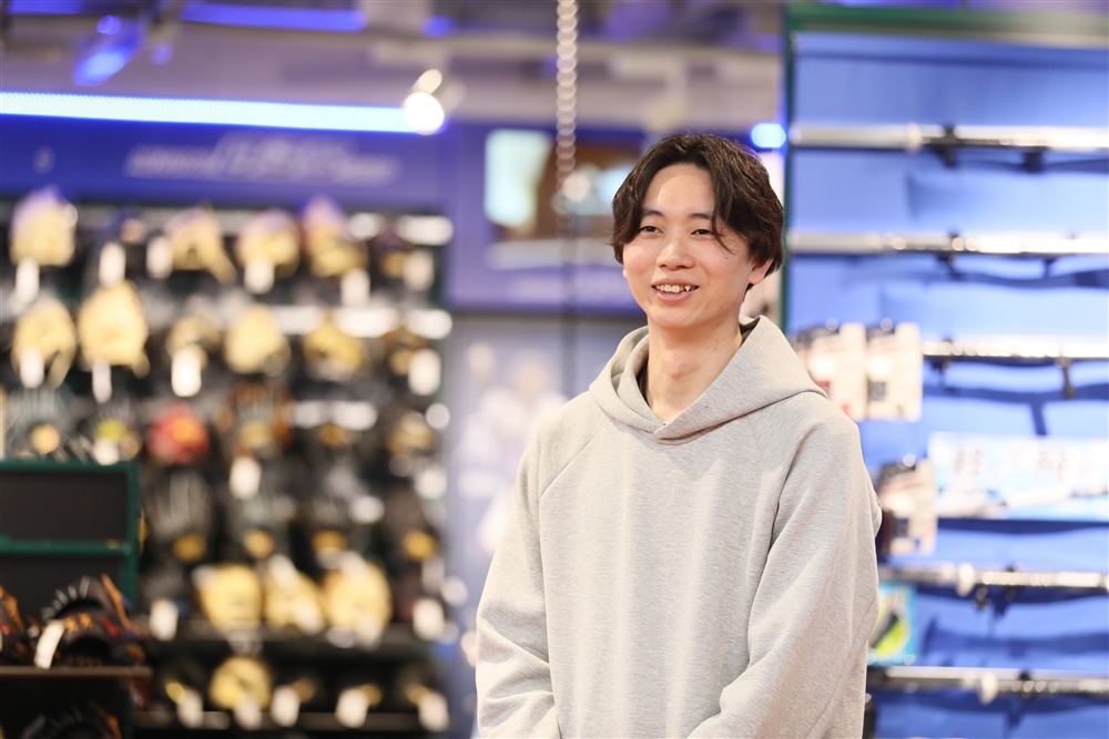 「野球アドバイザー」として、野球用品の接客販売、修理加工、商品管理を担当しています。また、接客販売以外にも、買い回りしやすく選びやすい、思わず手に取りたくなるような売場づくりも手掛けています。